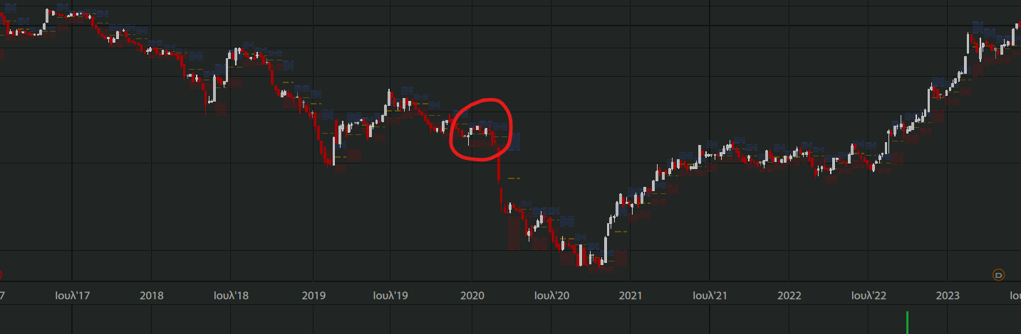Χωρίς να πιάσω κανένα σήμα αγοράς από το σύστημα συναλλαγών που χρησιμοποιούσα, αποφάσισα να προχωρήσω σε αγορές με το 40% των χρημάτων που είχα. Υπολόγισα ότι ο πάτος που έκανε το Φεβρουάριο του 2019 ήταν η τελευταία πτωτική κίνηση της μετοχής. Επιπλέον πίστευα ότι η εταιρεία θα επιβιώσει και θα ερχόταν η ώρα της. Γίνονταν τεράστιες προσπάθειες από τη διοίκηση για να ξαναβρεί το δρόμο της.