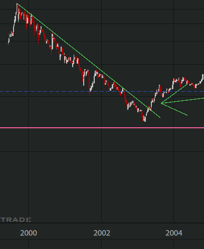 Συνέχιζα να παρακολουθώ την αγορά και αποφάσισα ότι αν δεν δω πραγματικά σημάδια αντιστροφής της πτωτικής τάσης δεν θα βάλω άλλα χρήματα στην αγορά. Δεν θα βιαζόμουν να προεξοφλήσω την τάση αλλά και δεν θα υιοθετούσα την τακτική περαιτέρω αγορών στην μετοχή για να ρίξω το κόστος της αγοράς μου. Ακόμα και όταν η μετοχή πήγε στην περιοχή των 0,45-0,50 σεντ δεν είχα αποφασίσει να αγοράσω. Είχα υποσχεθεί στον εαυτό μου ότι θα αγόραζα όταν θα έπιανα μακροπρόθεσμα σήματα αγοράς σύμφωνα με το σύστημα συναλλαγών που χρησιμοποιώ. Στον πάτο κανένα σύστημα που ακολουθεί την τάση δεν μπορεί να σου δώσει κανένα σήμα. Κάποιους σχηματισμούς τους βλέπεις αλλά αν είσαι ακόμα πληγωμένος από τις ζημιές που έπαθες δεν αποφασίζεις να μπεις.