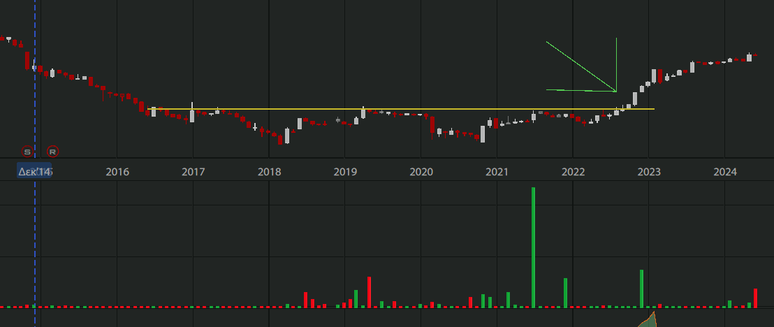 Ξαφνικά τον Αύγουστο του 2022 η μετοχή μου έκανε τη χάρη και διάσπασε ανοδικά το σχηματισμό. Εκεί ξαφνικά χωρίς δισταγμό και με αποφασιστικότητα αγόρασα μεγάλης αξίας μετοχές. Επένδυσα όλα τα χρήματα που είχα. Ήμουν αποφασισμένος να αρπάξω αυτή την ευκαιρία.