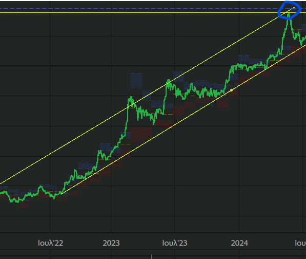 Τον Ιούνιο του 2023 η άνοδος ανακόπηκε στα 3 ευρώ και η μετοχή πήγαινε πλάγια για 5 μήνες. Αυτή η κίνηση μου έδωσε ακόμα ένα σημαντικό στοιχείο στο σχεδιάγραμμα. Σχηματίστηκε μια αξιόπιστη ανοδική γραμμή τάσης με ανοδικούς πυθμένες.
