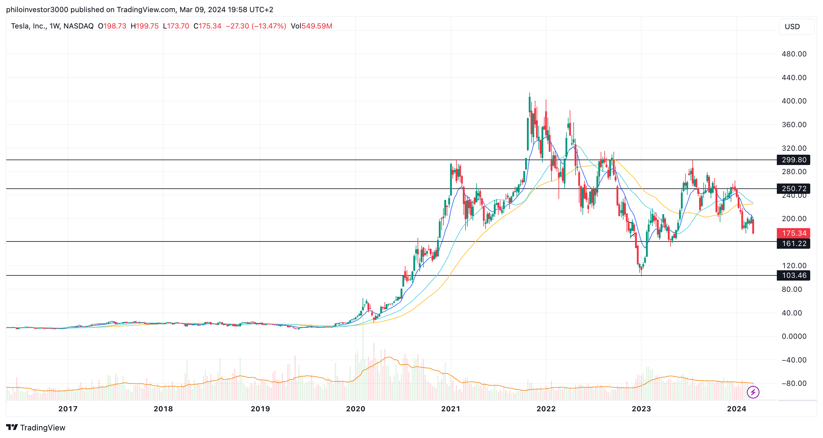 Purely technically on Tesla there isn’t much to say, the stock peaked in November 2021 after a parabolic move that was stopped in its tracks (that’s when Elon sold a bunch). The stock has been dominated by sharp sell-offs and sideways moves since — ok sharp rallies too.