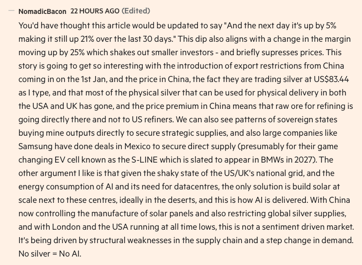 This FT reader seems to be citing the following fundamentals as reason for Silver to continue moving up.