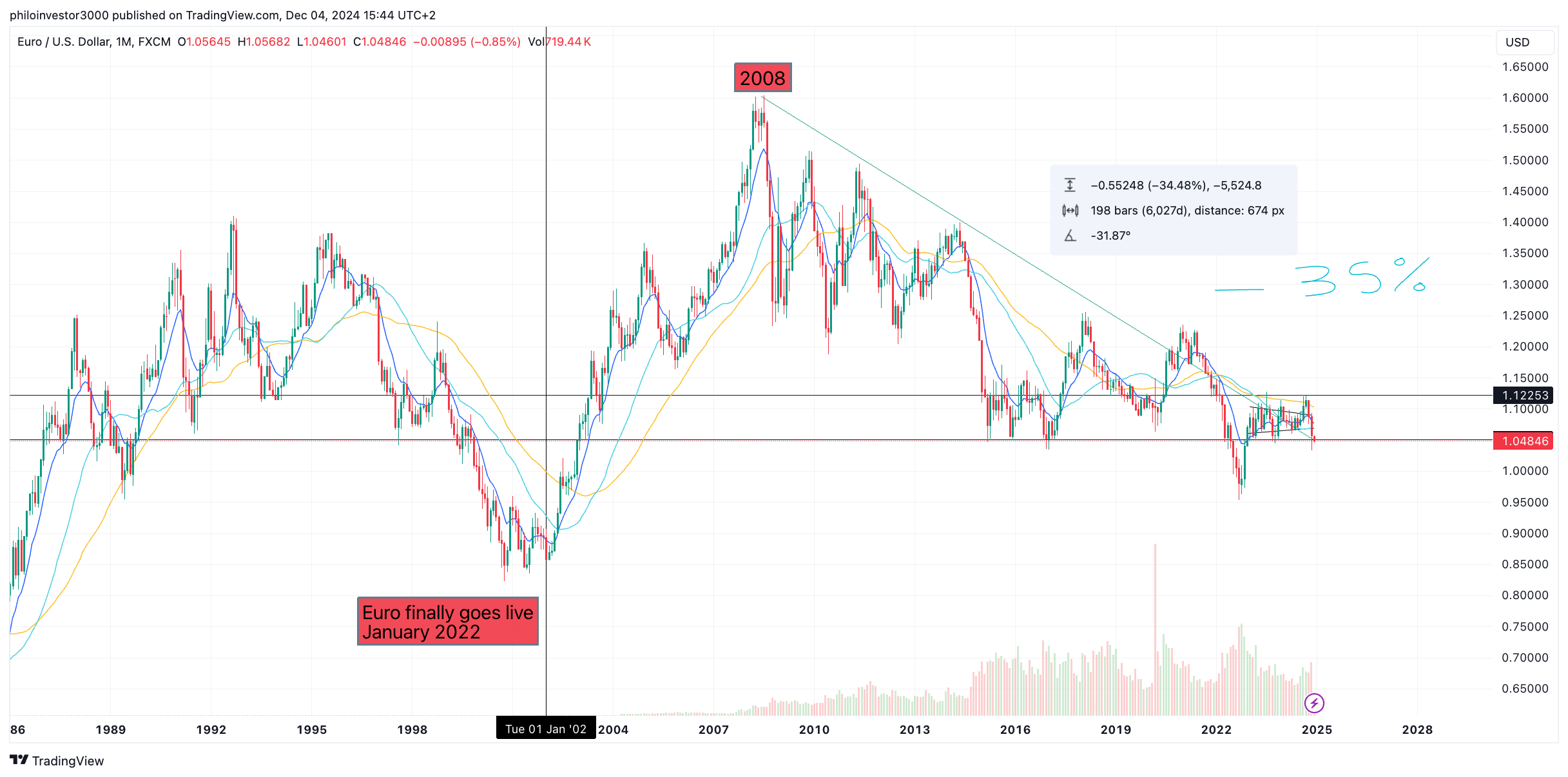 That notion now is long forgotten. The Euro has been in a steady downtrend, as seen by the monthly long-term chart shown below.