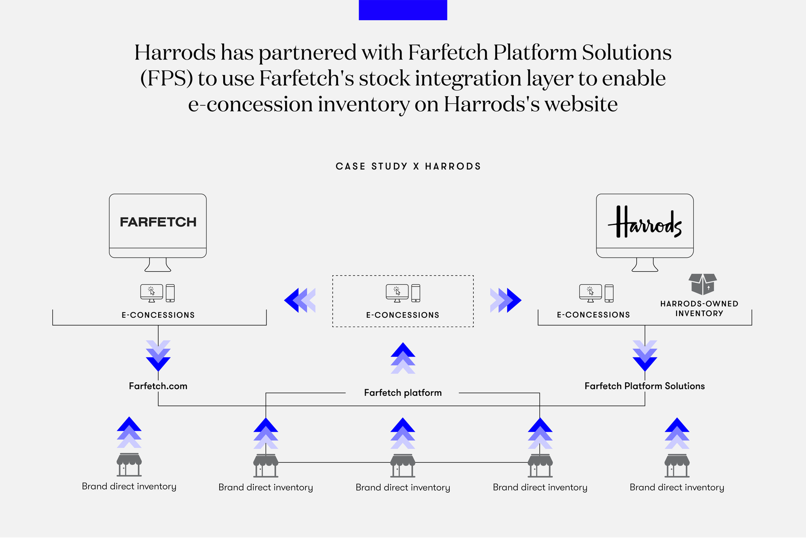 Farfetch is now pushing what it calls e-concessions as a service. This means that Farfetch can handle the sales of a brand made through a multi-brand department store’s website. The department store doesn’t need to buy or hold inventory (as in a traditional wholesale relationship), as Farfetch directly plugs in to brand stock systems. E-concessions enable multi-brand retailers to offer a greater assortment of a brand’s inventory, as it can list the same products across multiple sites from the same bucket of inventory. José calls this infinite shelves.