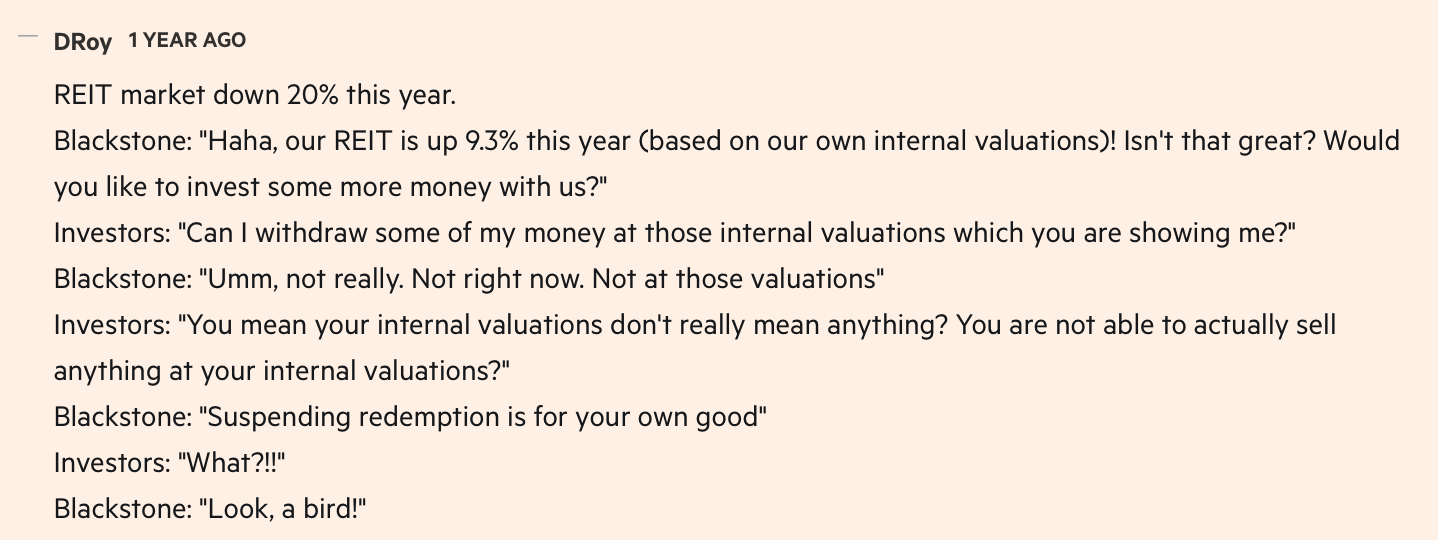 This comment on the FT illustrates in a comic way how the BREIT, by not being publicly traded, was able to report vastly different performance relative to its listed peers — giving rise to a private-to-public arbitrage that its LPs wanted to extract. ↩