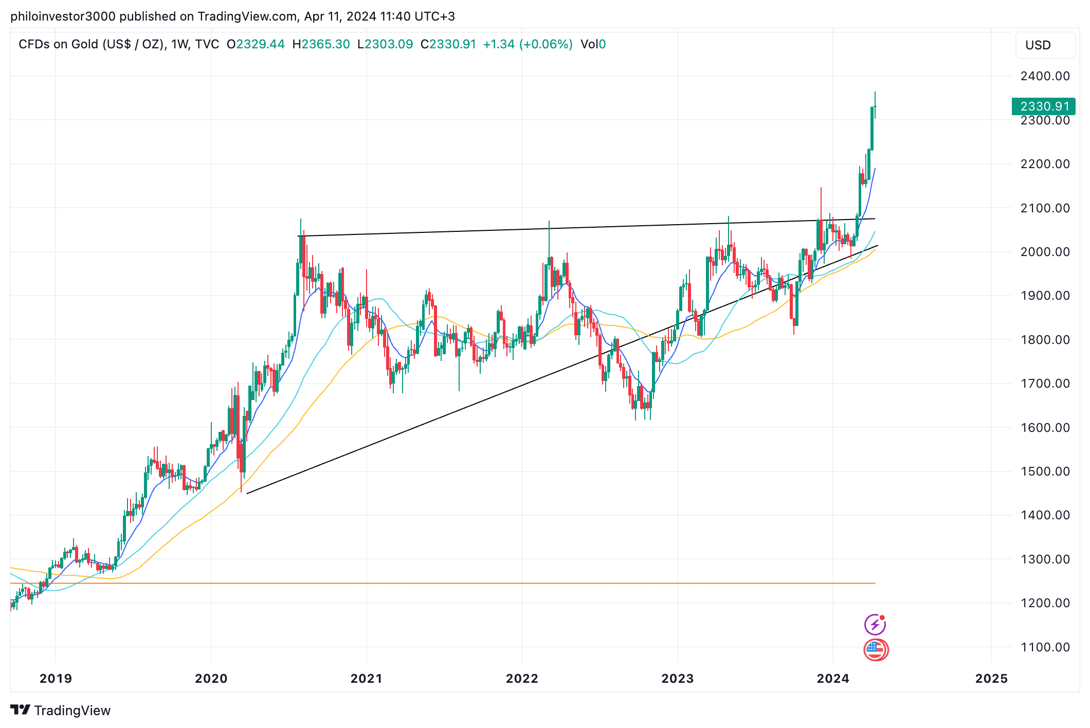 I talked about Gold in a previous podcast here โ when it was breaking out of a multi-year ascending triangle. Listen to it below.