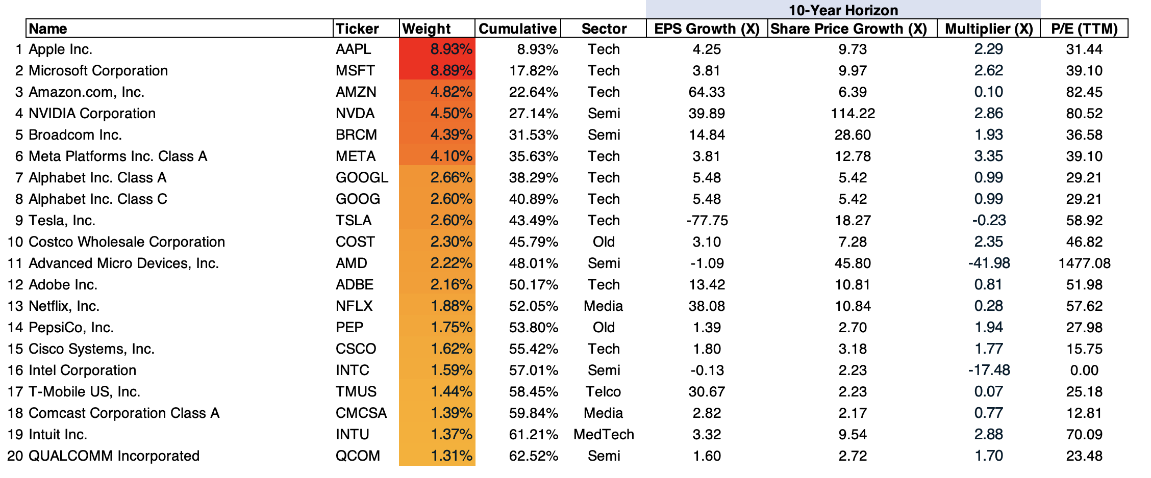 Its top 20 constituents make up 62.5% of the index and they are concentrated in Tech and Semi names. I created the table below to give us a visual representation of the Nasdaq top 20 and how share prices have performed relative to Earnings per Shares (EPS) growth.