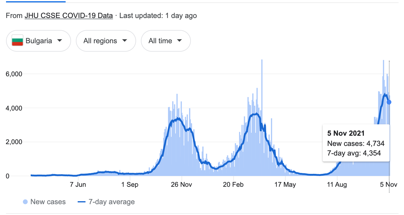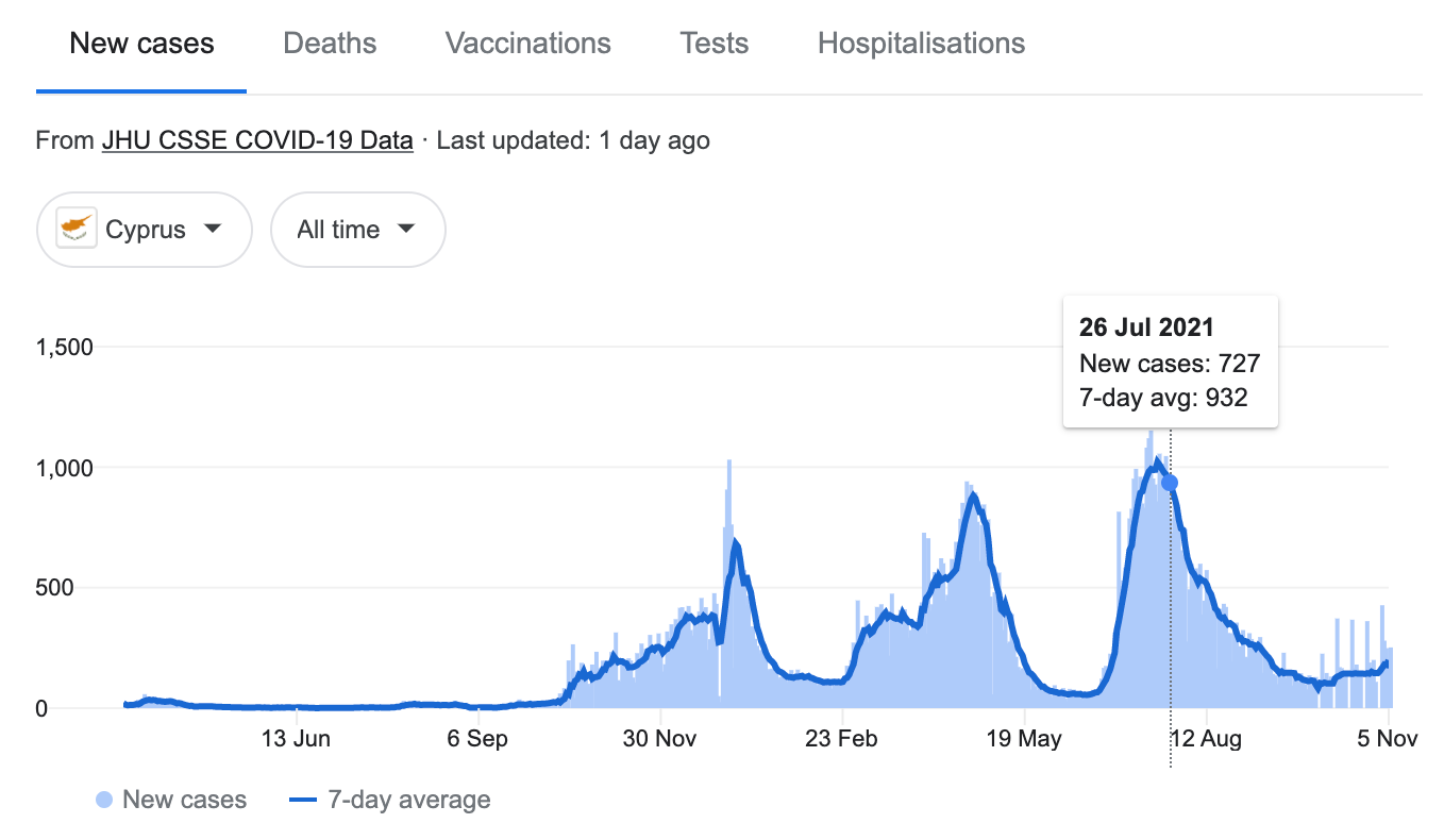 Deaths in Bulgaria and Romania have been spiking materially, in line with new cases. Deaths in Greece are also elevated but seem to be controlled. Deaths in Cyprus remain at a very low level.