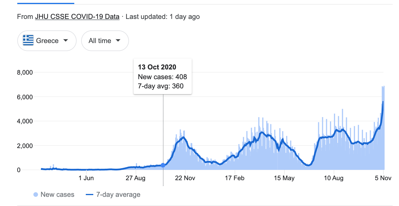 Greece. After being the poster child for low covid cases and a relatively easy summer 2020, coronavirus cases finally spiked near the end of 2020. Things have been bad ever since.