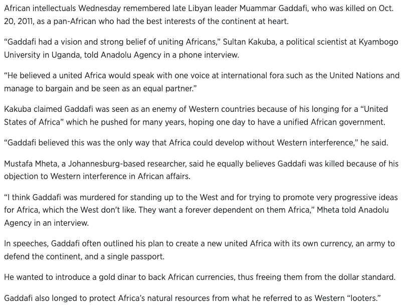 Qaddafi was very vocal about a union of African countries and funded other African nations that weren’t wealthy like Libya, to engage in development and initiatives. Libya was wealthy because of oil production — allowing Qaddafi to have a material influence all over Africa. His proclamations are all over the internet and not hard to find.