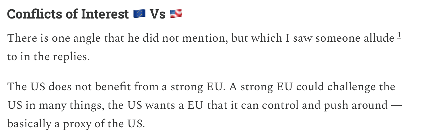 And so this viral thread on X here forgot to mention this basic conflict of interest, that the US doesn’t want a strong EU at par with the US. And until the EU stands up to the US, nothing will change.