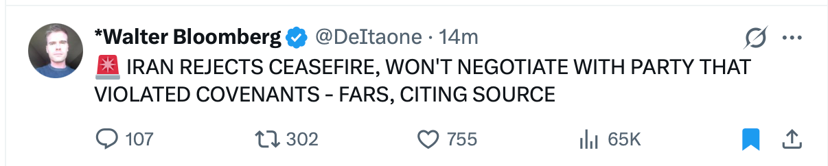 News flow = Witkoff/Kushner preparing for negotiations. Highly doubt the Iranians will ever speak to that duo ever again. Or anyone for that matter. I remind you that Russia and Ukraine have practically been in negotiations for 2 years, yet the war is still on.