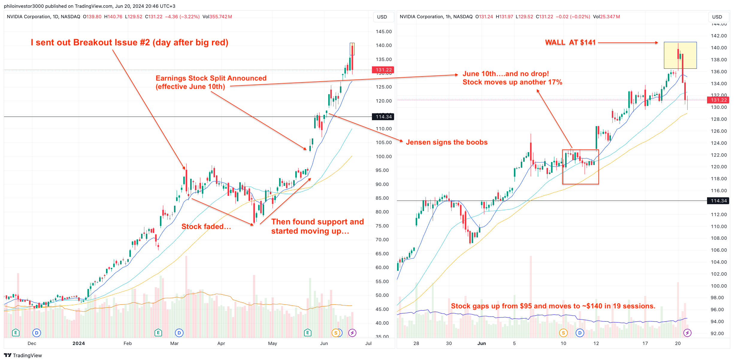 Here’s the NVIDIA chart, with annotations of the important events / market reactions and how I traded it.