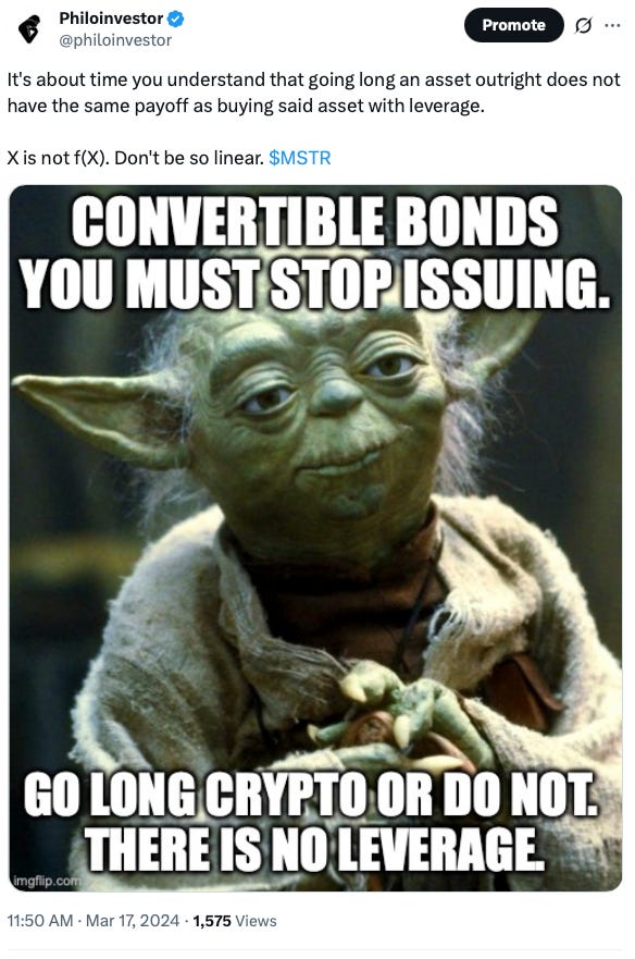 We explained in DYC 2.0 that Saylor’s “infinite money glitch” was basically the result of an arbitrage handed over to their convertible debt buyers. 1) They had security of capital because they owned a bond but 2) open upside because they owned a bond convertible to shares on certain conditions.