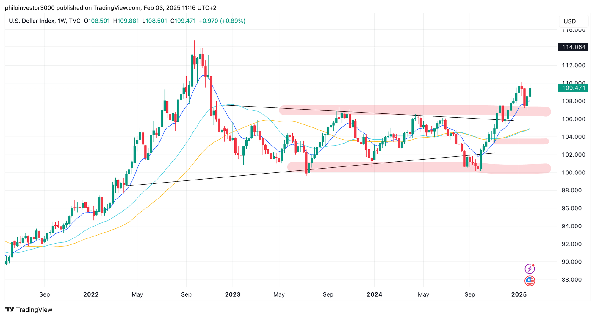 The DXY broke above our long-term 7% range (refer to previous issues) and is still holding up. Two themes are causing this: 1) sticky inflation which forced J-Pow to shift the Fed’s rhetoric about rate cuts within 2025 and 2) Trump rhetoric and all this hostility against other countries.