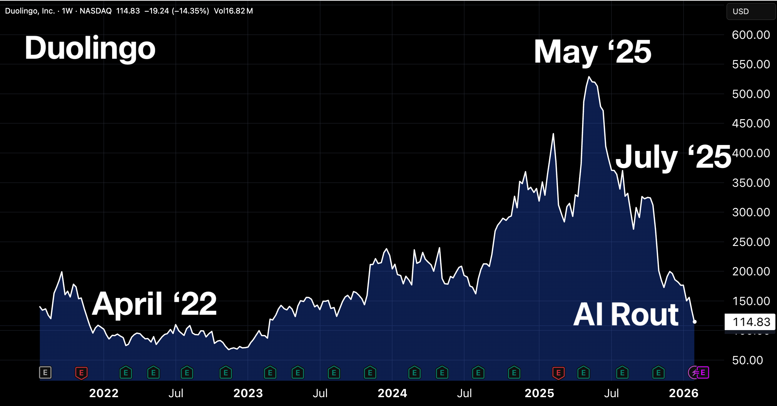 Now let's look into Duolingo's AI loser narrative, management's pivot from monetisation to retention, and an overstretched valuation. Together, the three drove a ~75% sell-off in Duolingo stock.