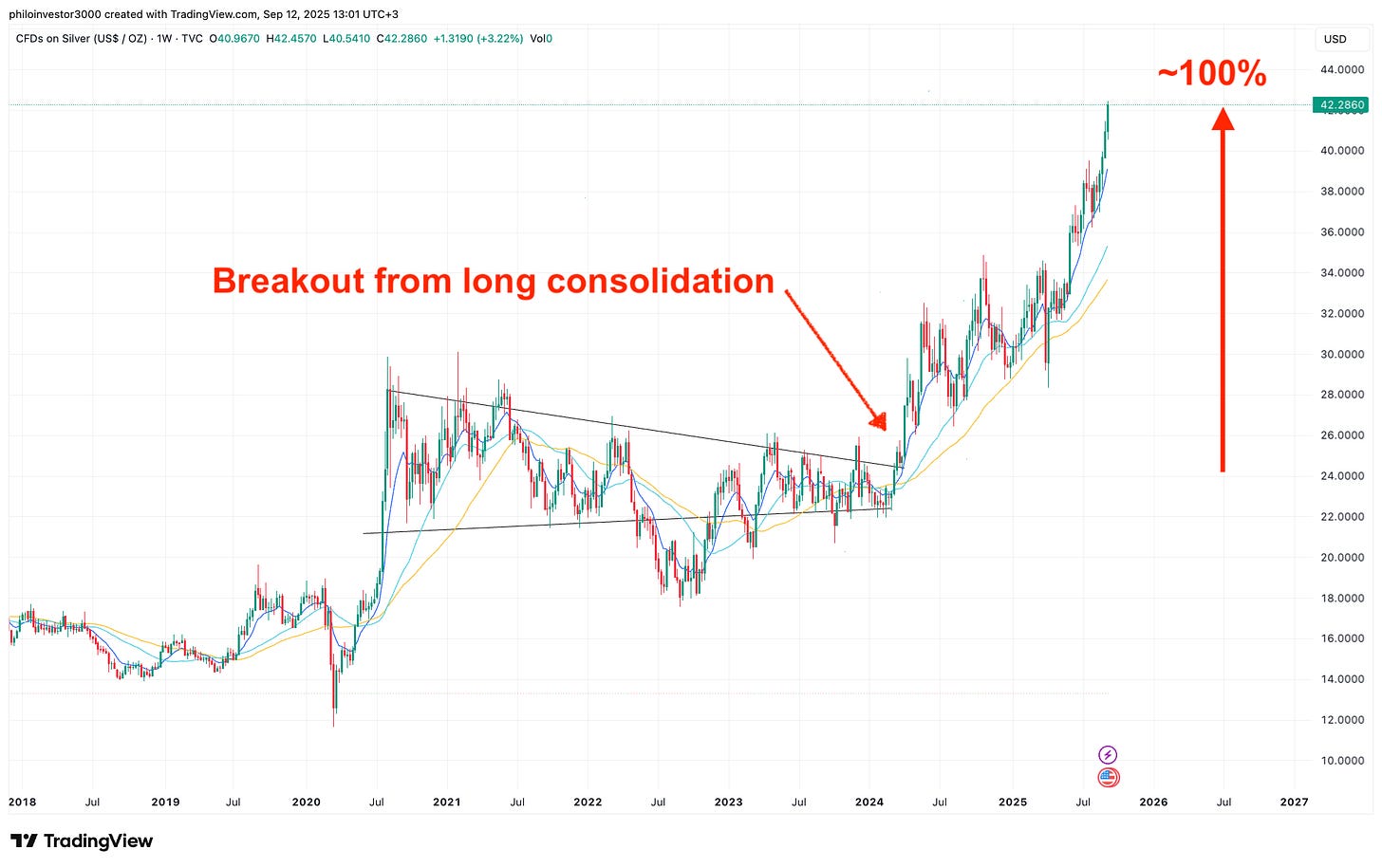Up almost 100% since it broke out from the pattern shown below. Gold and Silver can both go way higher as demand spikes and supply becomes harder — both at the same time.