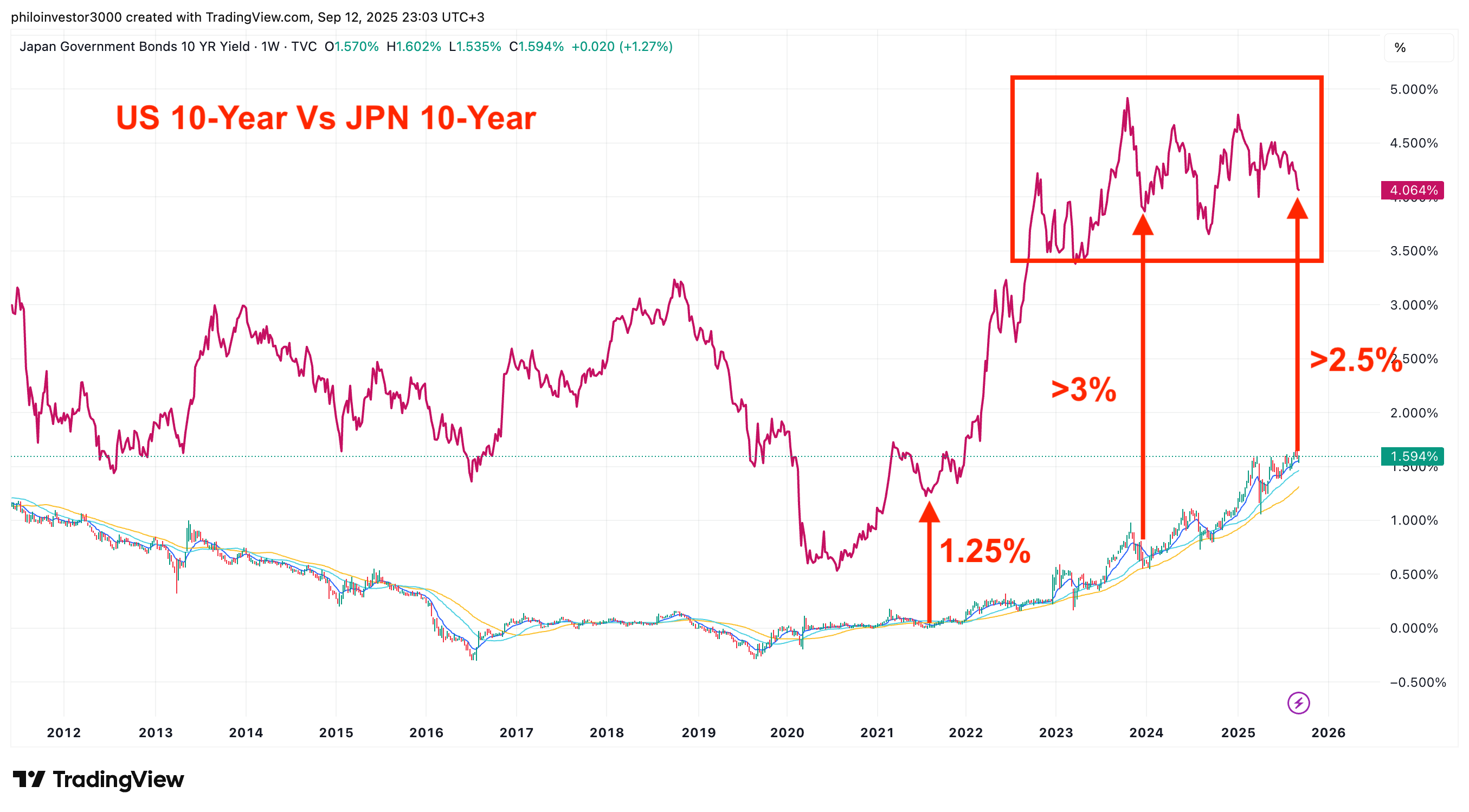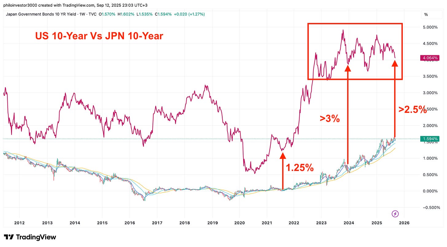 The Japanese 10-year yield is moving up as Japan unwinds zero-ish interest rates, but the US 10-year is also moving up.
