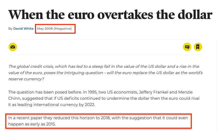 I remember some 20 years ago, when the Euro and the EU was still on the up and up — the narrative was gaining ground that the Euro would outshine the Dollar and that it would become the next reserve currency.