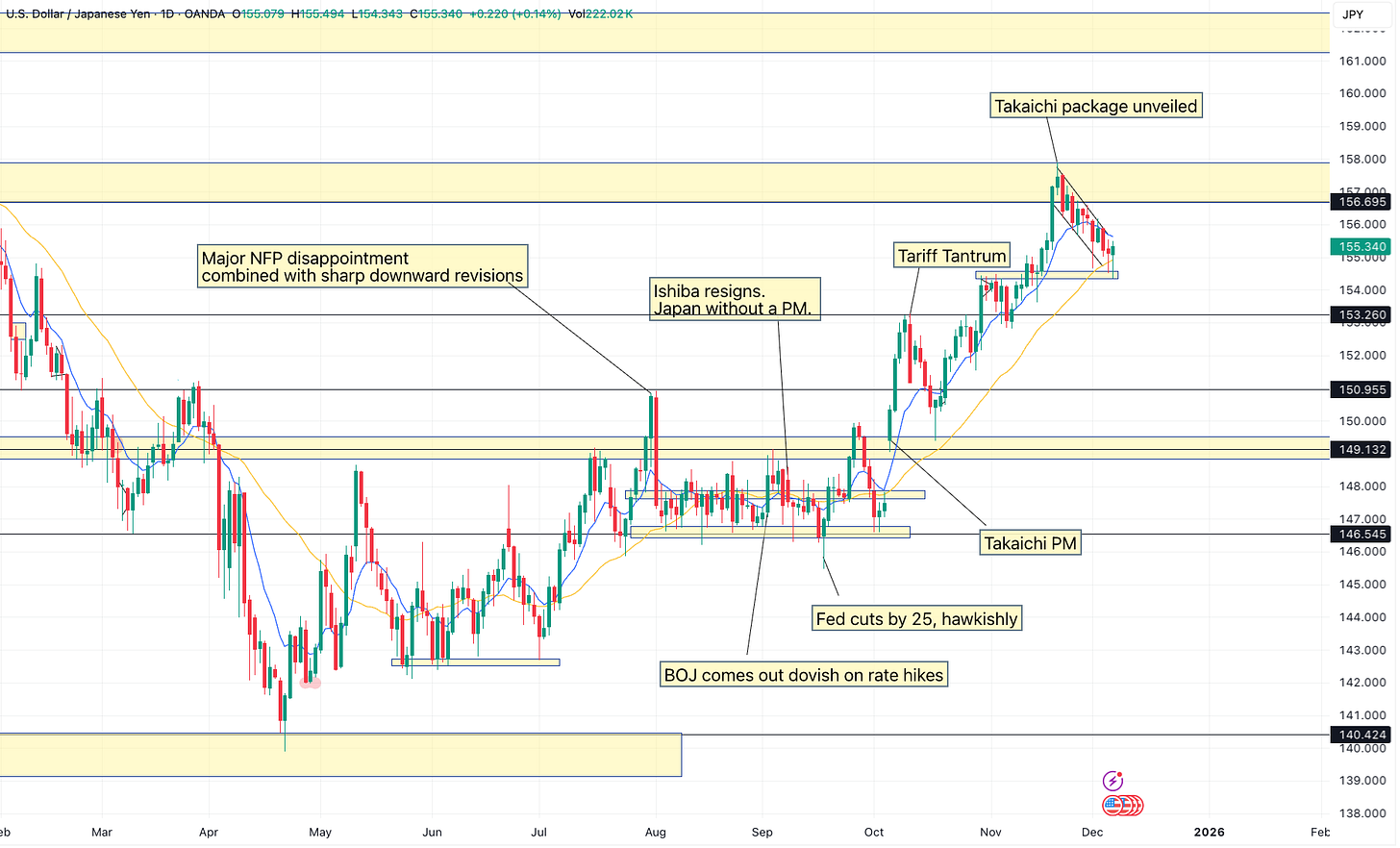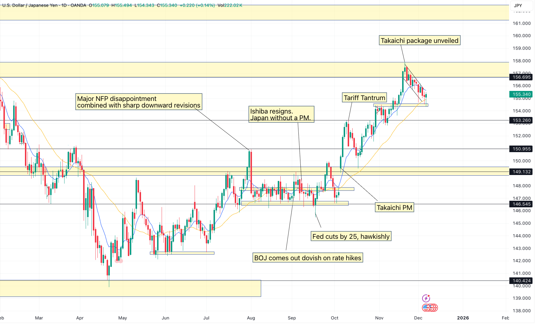 We traded the long side perfectly and went flat at 156.2 — and remain flat. Market is finding support around the MA50 as Yen holders *remain* reluctant in holding the world’s second most hated currency (Turkish Lira #1, lol)