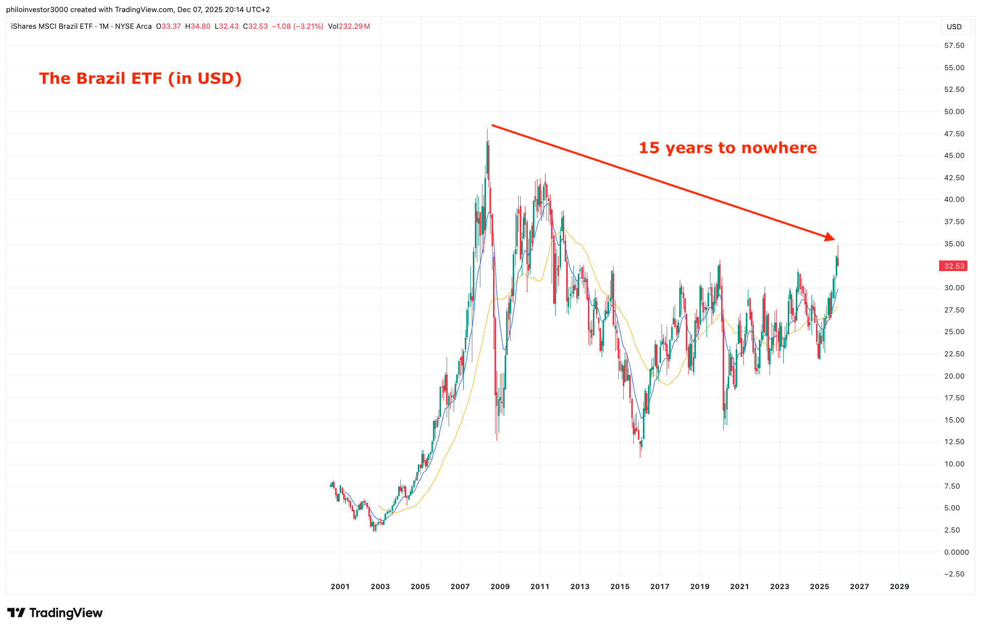 The Brazil ETF: EWZ — has gone nowhere (to down) in 15 years. But note it’s dollar denominated. The actual Brazilian stock market has been rallying simple because the Real (their local currency) has been inflating massively.
