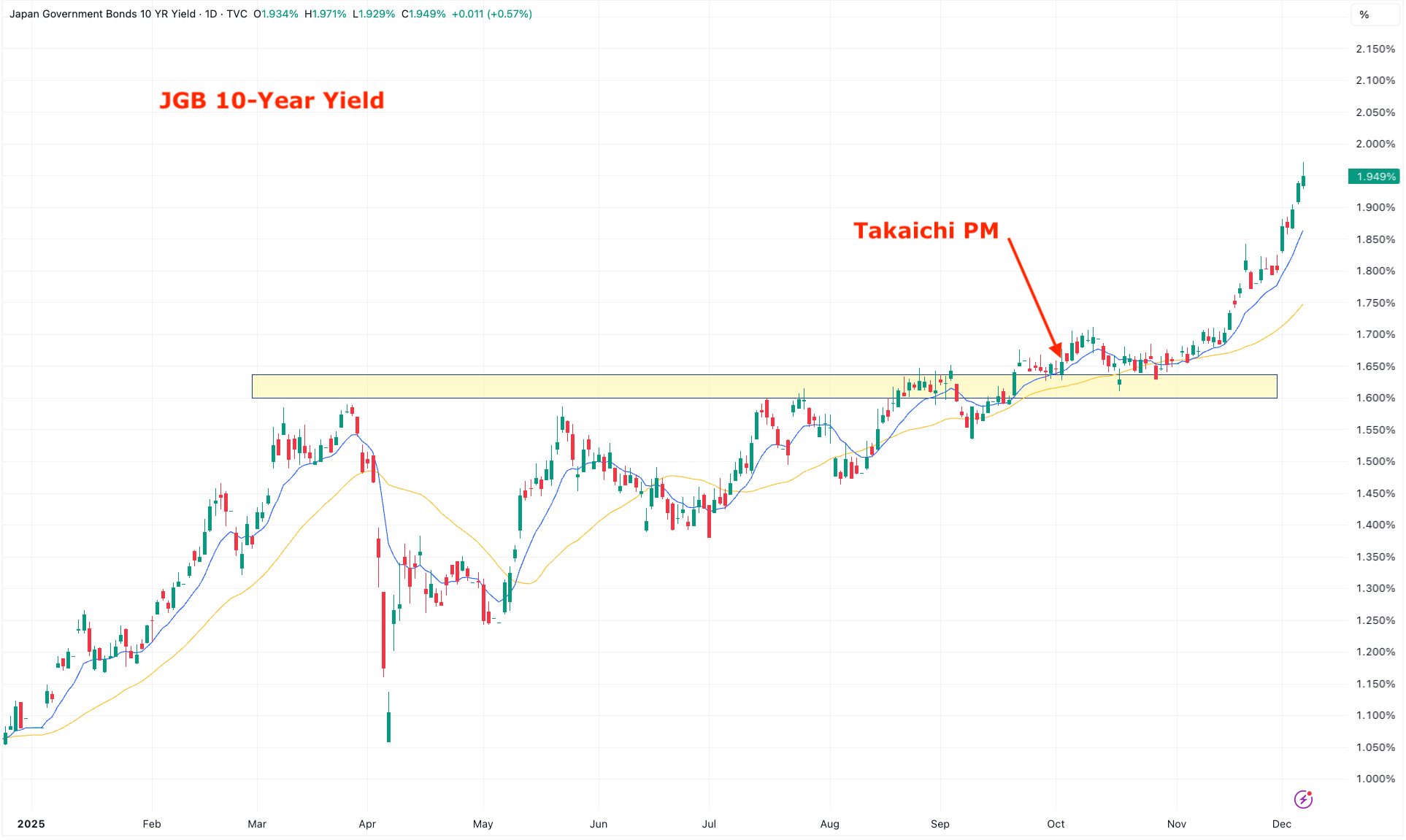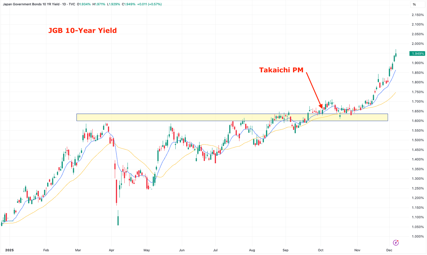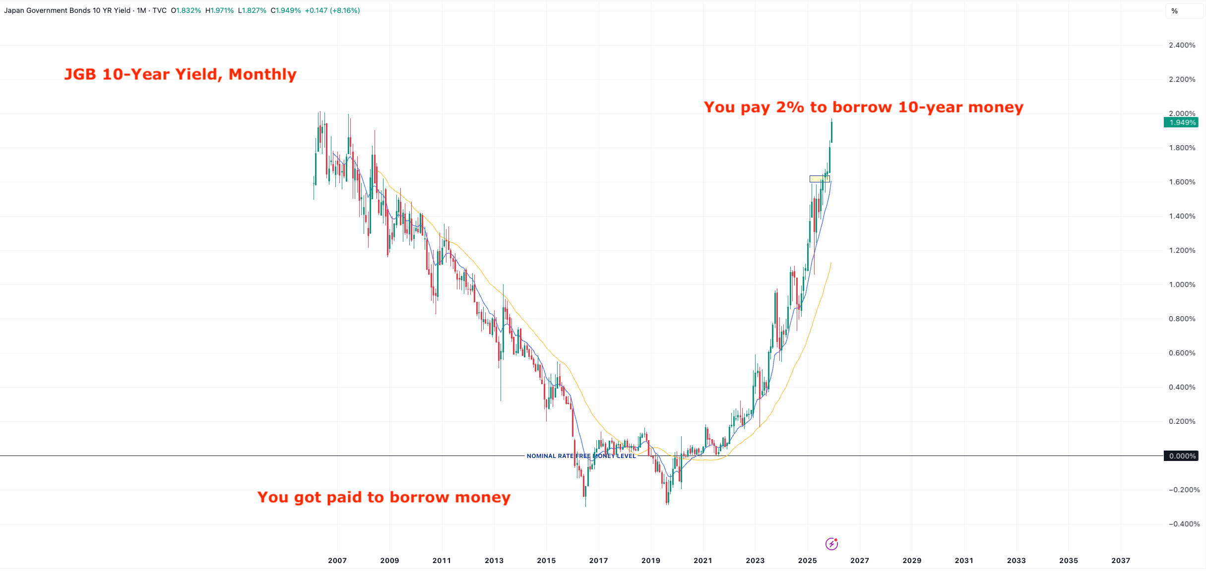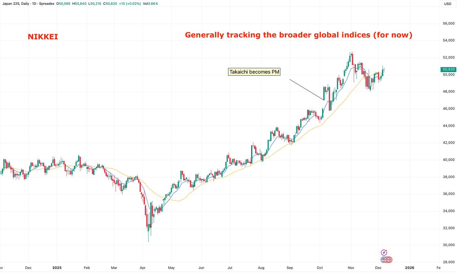 And now Takaichi is trying to repeat the Abenomics playbook with the market responding mostly the same way. Yen down, stonks up. The problem now however is spiking yields on JGBs making their Godzilla-sized sovereign debt unsustainabruuuuu!!!