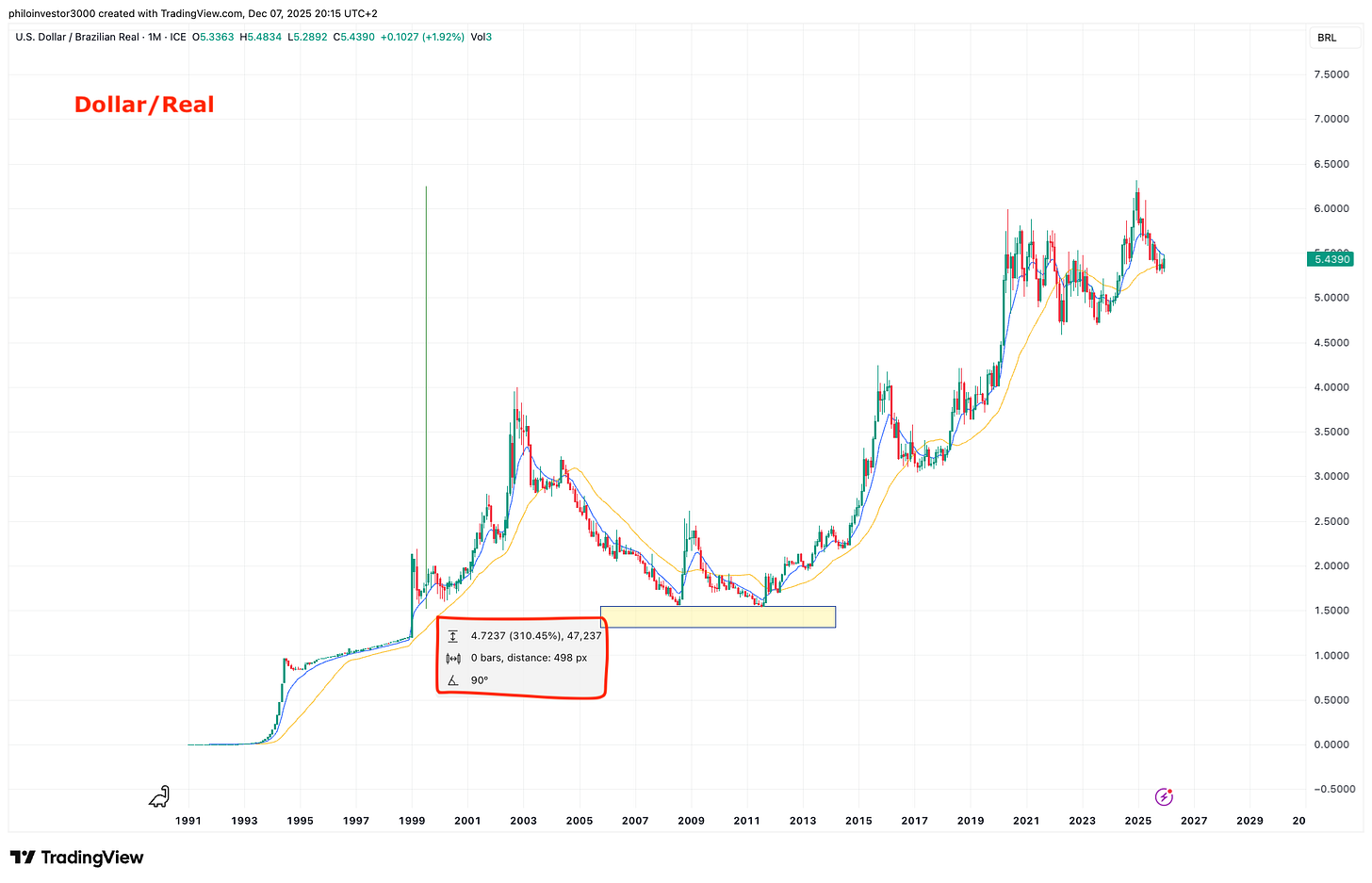 USD/BRL up more than 3X in 15 years — but the market hit a wall next year. We elaborate on the Brazil setup here 👇
