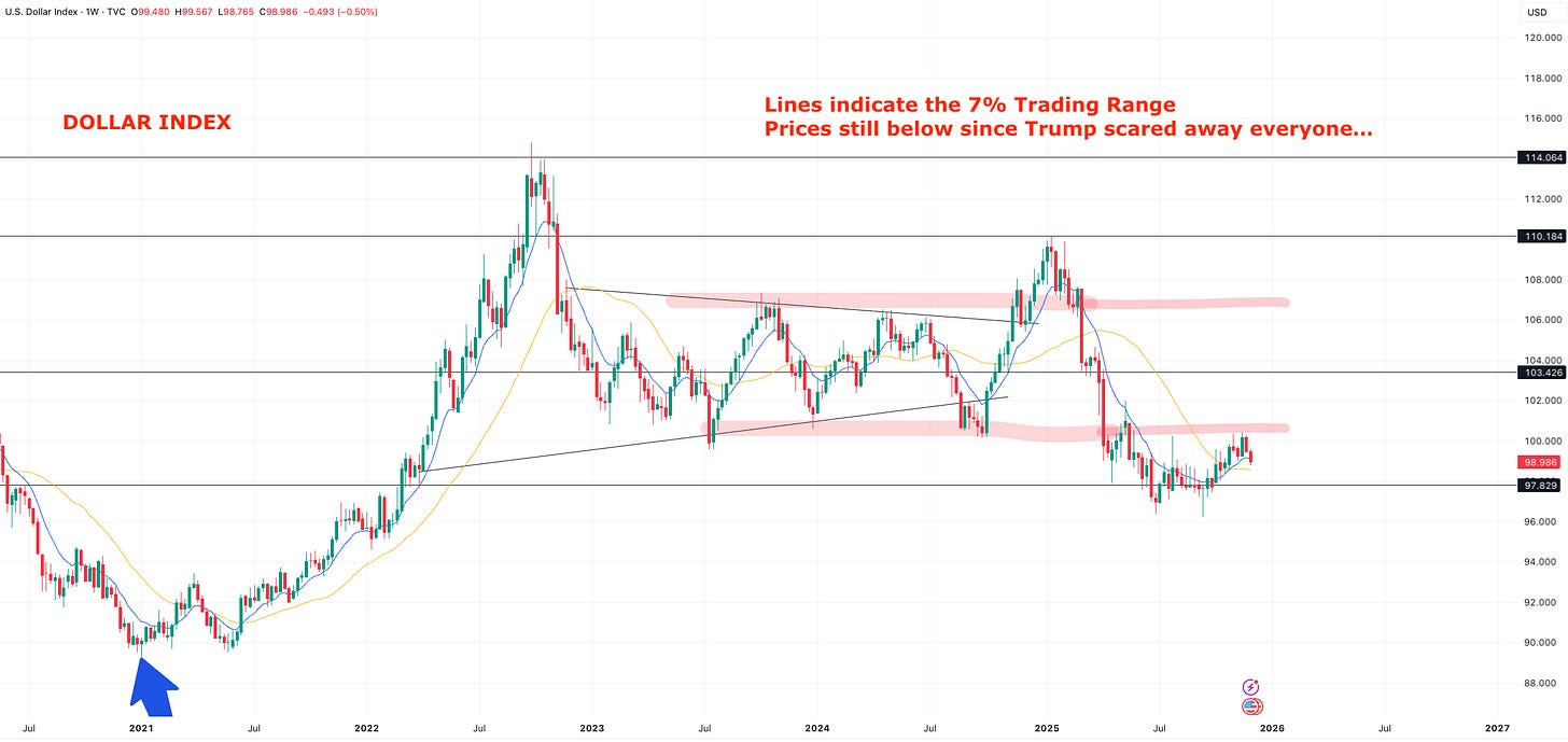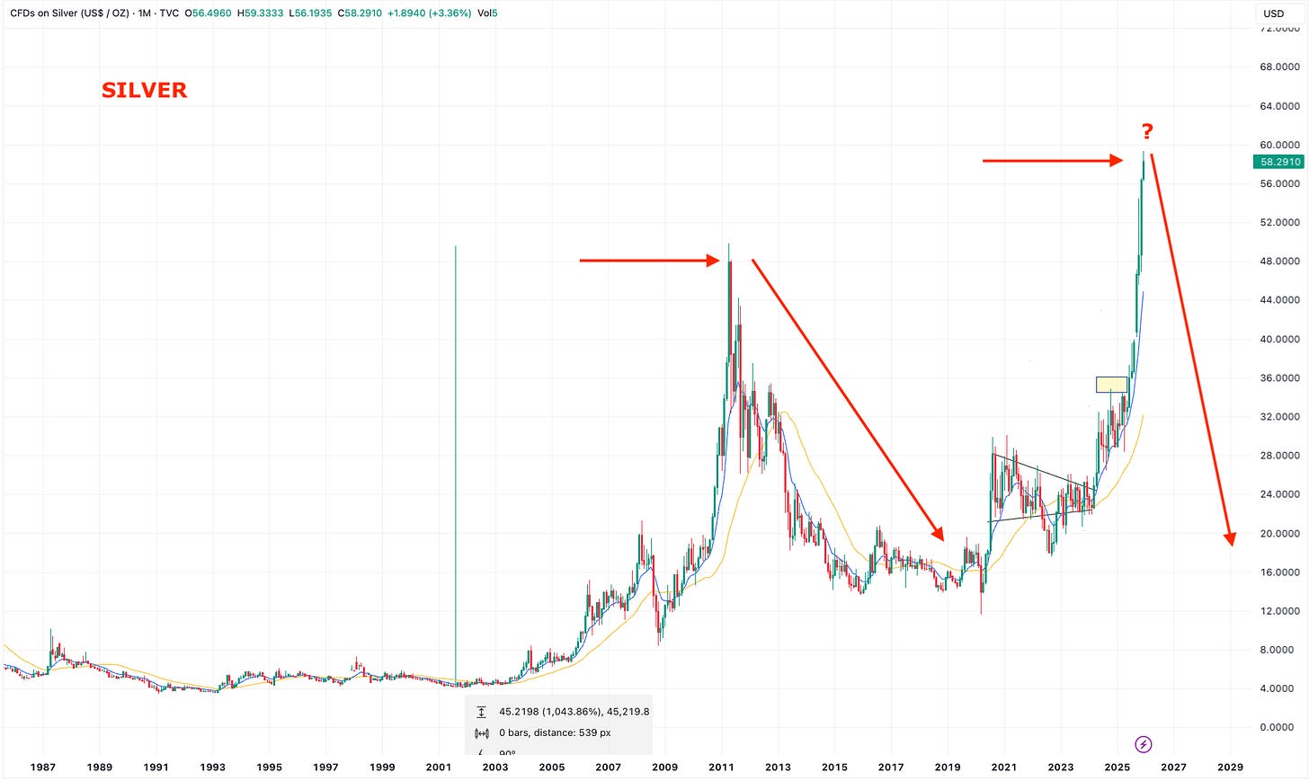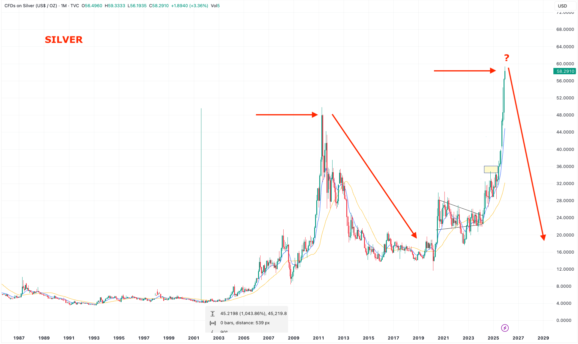 But zooming out for historical context, here’s how Silver behaves and tells the picture of how many got burned on this market (don’t forget to include opportunity and carrying costs!)