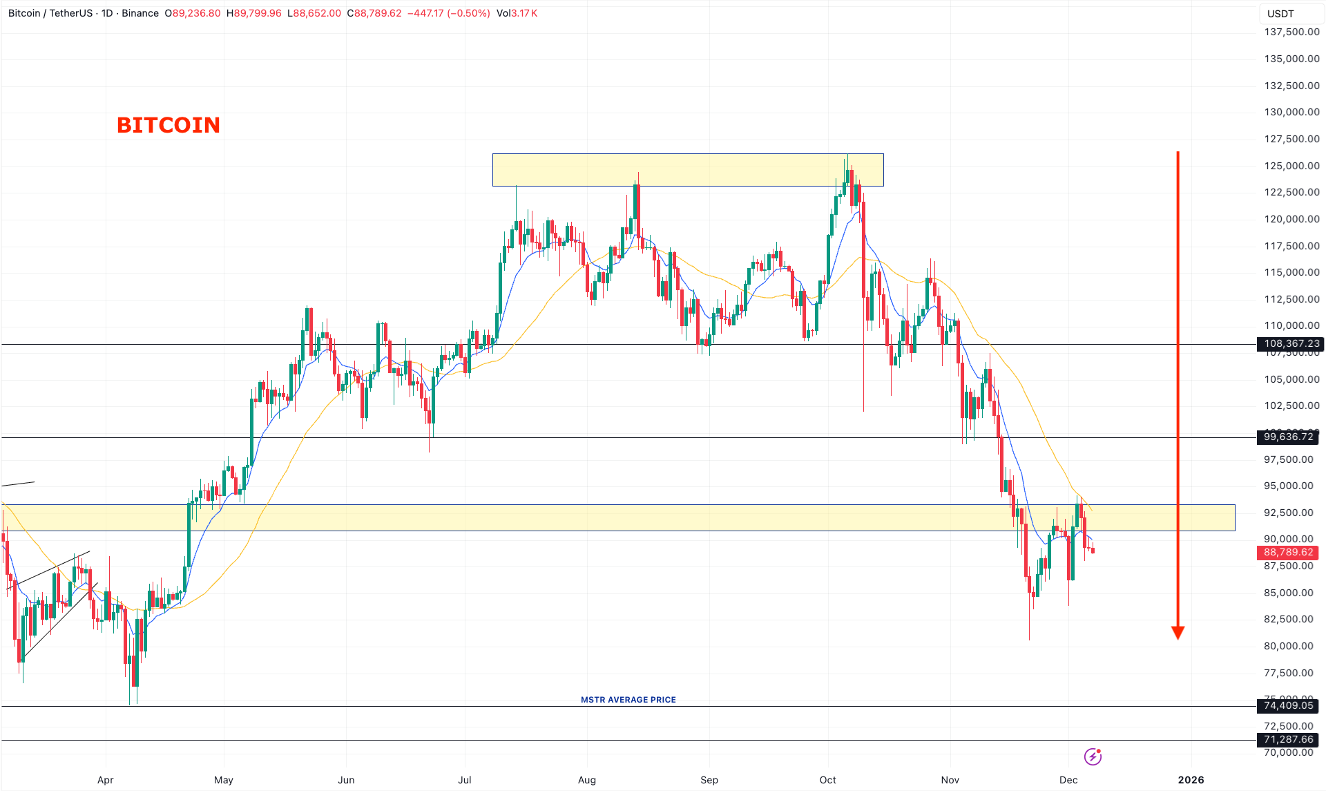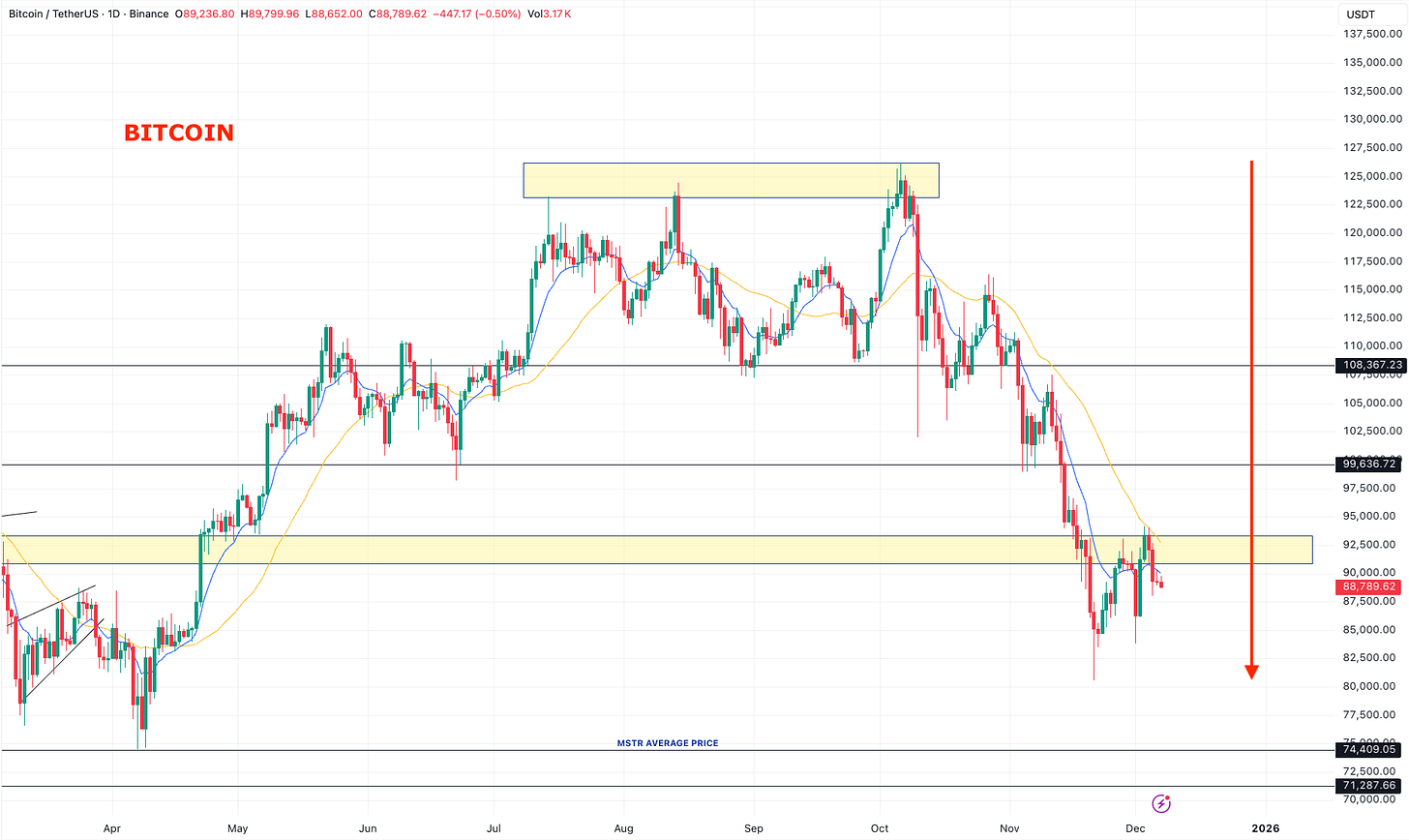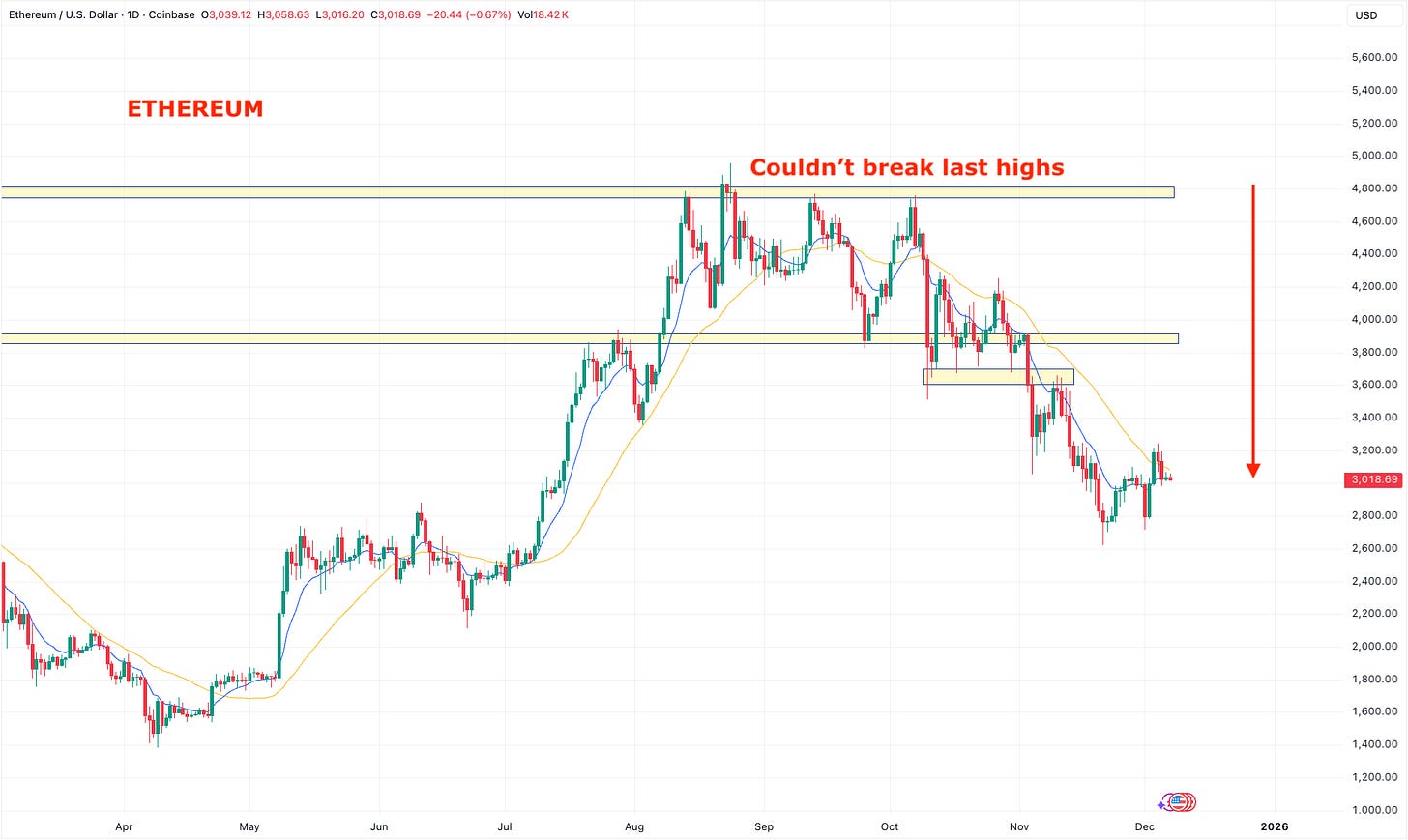 Similar story with ETH which failed perfectly at the level. The last highs labelled below goes far back as November ‘21. If you refer to previous Breakouts you will see we faded expectations that ETH had the power to break through. Sorry Tom Lee.