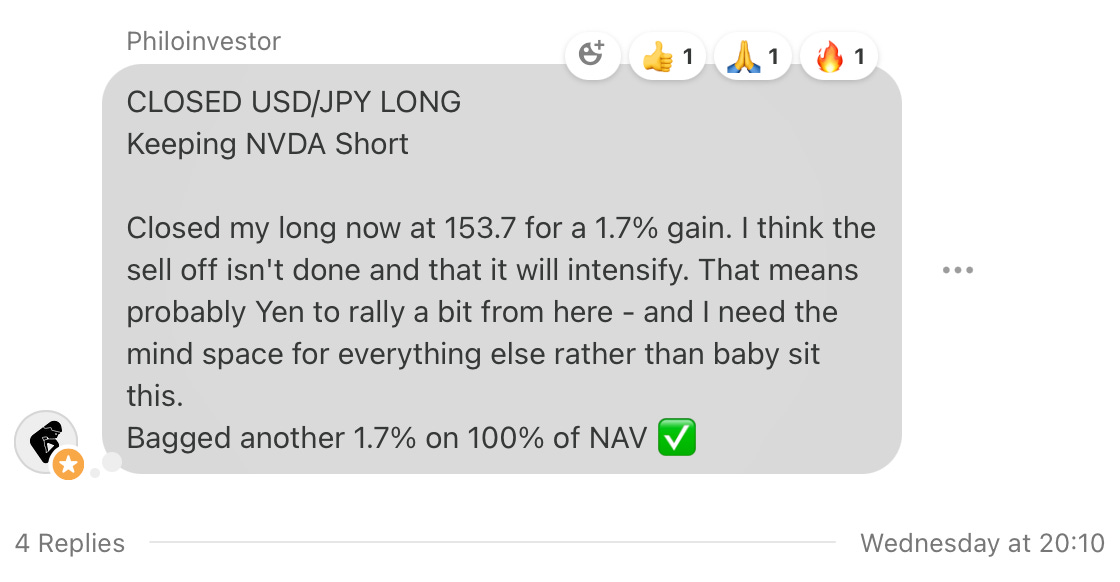 But not only that, I closed my USD/JPY Long at 153.7 for a 1.7% profit on 100% of NAV because I expected a broader sell-off which would probably push the Yen a bit higher.