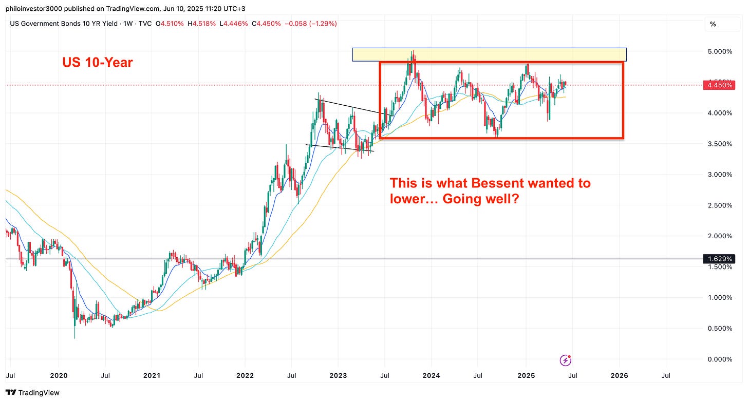 Half the Trump 2.0 plan was to reduce the cost of the monstrous debt — and start to make it sustainable again.. But it was all empty rhetoric. Luckily for the Treasury, the yield is still below 5%.. For now. Deficit this year expected to be $2 trillion..