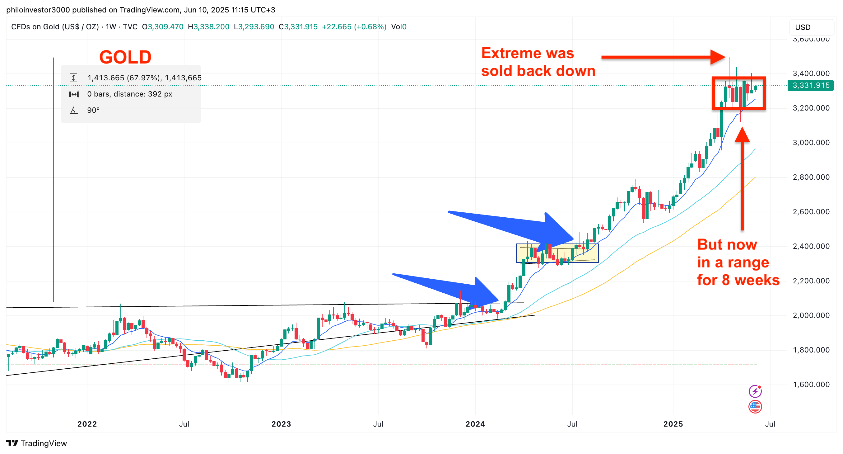 In the last issue we touch upon Gold’s over-extended parabolic move — underpinned by a loss in trust in the US. The overextended move is now finding support on the Weekly EMA10 and consolidating in a tight range. This probably means another move up, unless the picture changes and we see the technical picture breaking down.