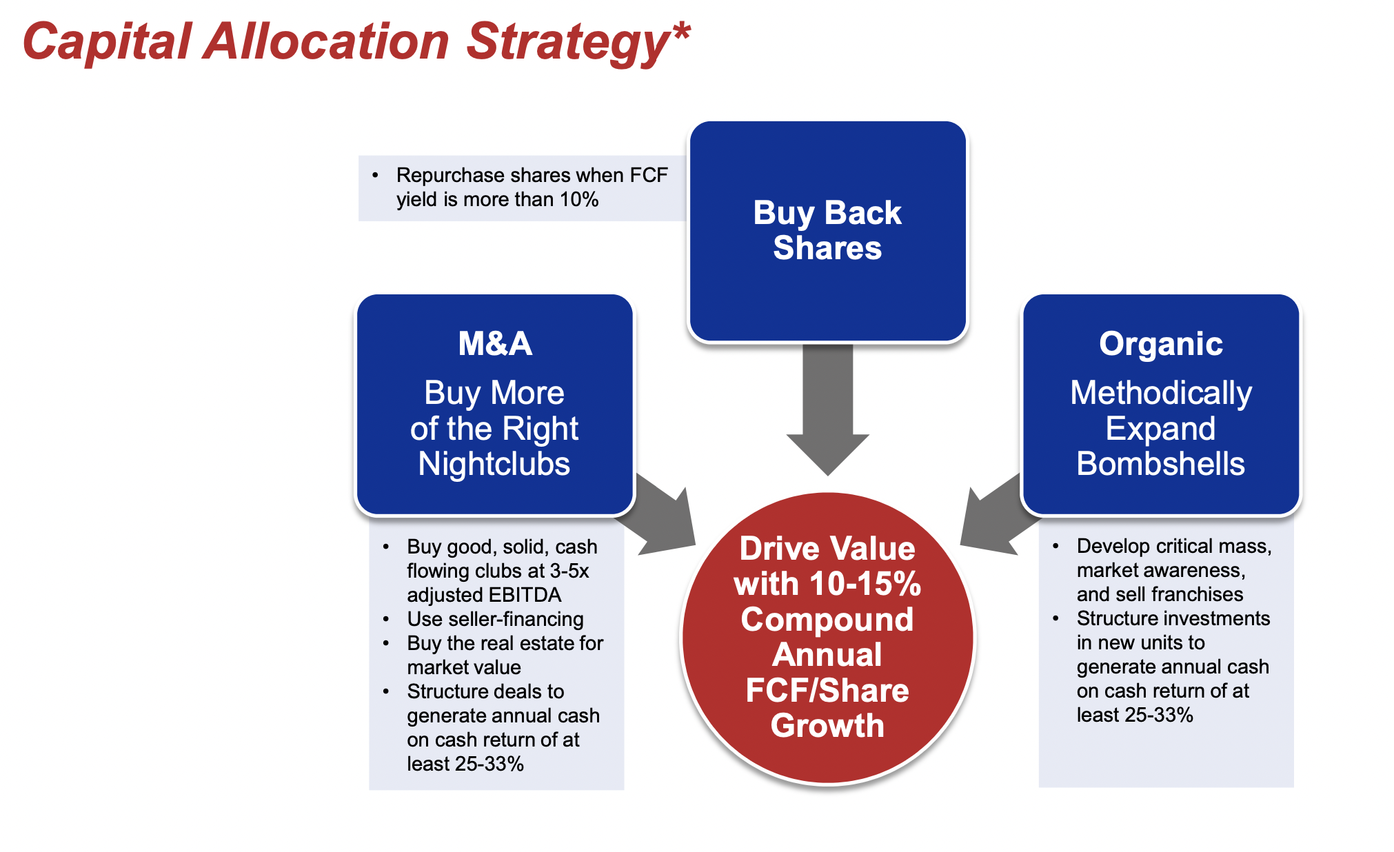 Expect the company to grow inorganically fast by acquiring nightclubs at highly accretive cash on cash returns ($20mln EBITDA targeted for FY23) and organically by continuing the Bombshells expansion.