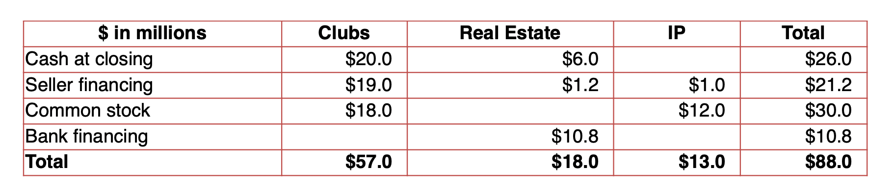 RCI laid out $26 mln in cash, issued 500,000 new shares at $60/share (total $30 mln), and borrowed $32 mln to fund this acquisition. These clubs earned $14 million EBITDA in 2019 and could even earn more as management cuts the fat and boost club visibility.