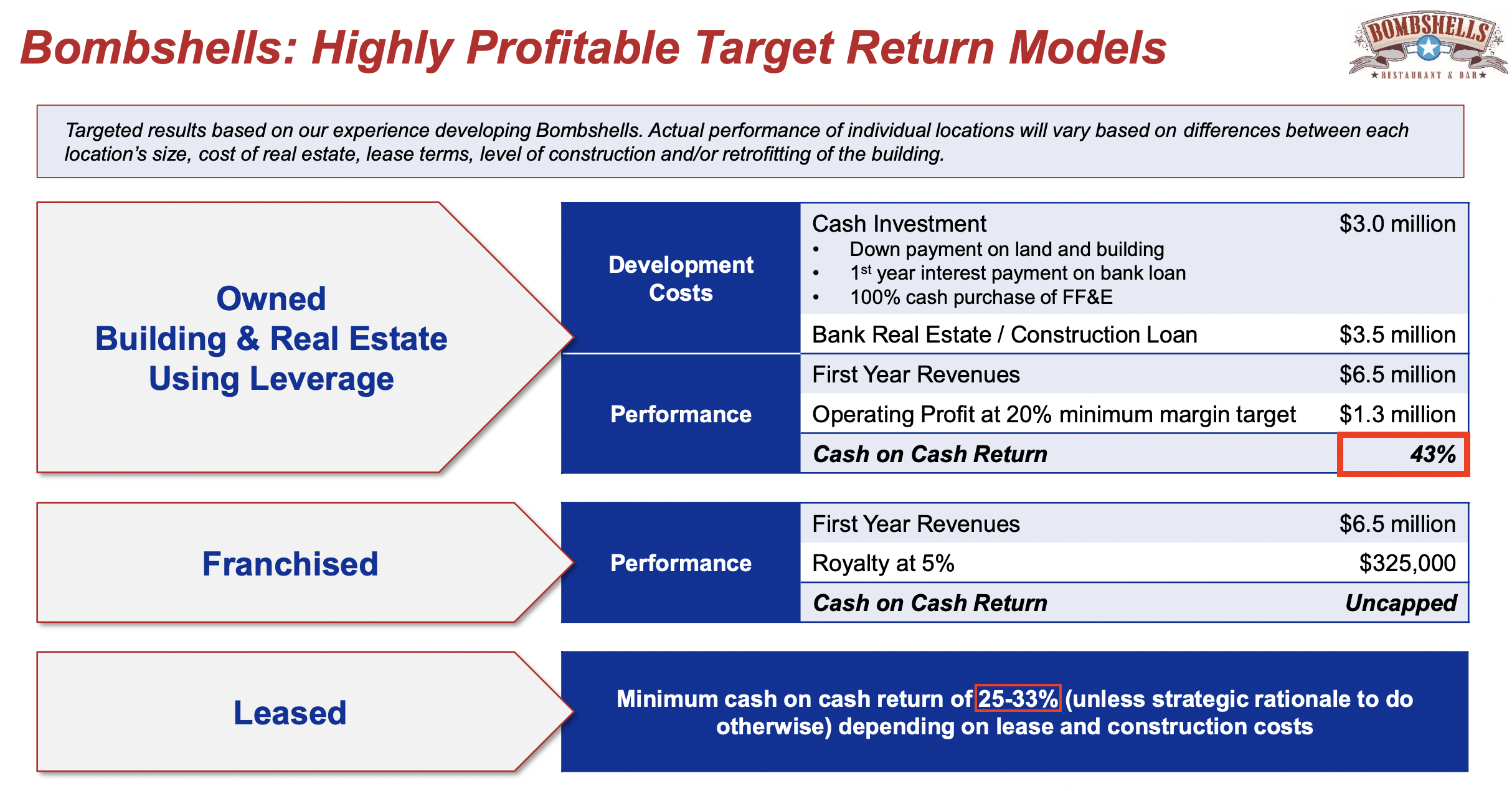 Borrowing half the required investment or leasing the property cuts the investment by half, so the company only has to outlay ~$3 million in cash per unit. These are the target returns 👇