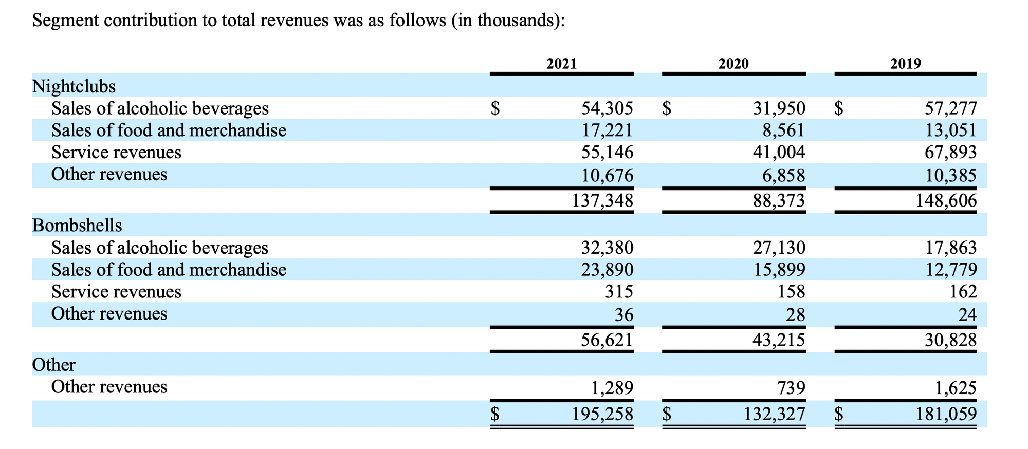 40% and 60% of Sales for Nightclubs and Bombshells respectively were alcoholic beverages. So you understand why gross margins are so high — 88% for Nightclubs and 76% for Bombshells. Highly profitable Service revenues for Nightclubs also helps!