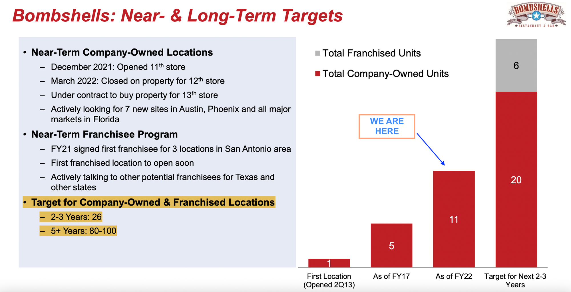 The first Bombshells was opened in 2013, and since then another 10 were developed. The target is 26 Bombshell locations in the next 2-3 years, and 80-100 in the next 5+ years.