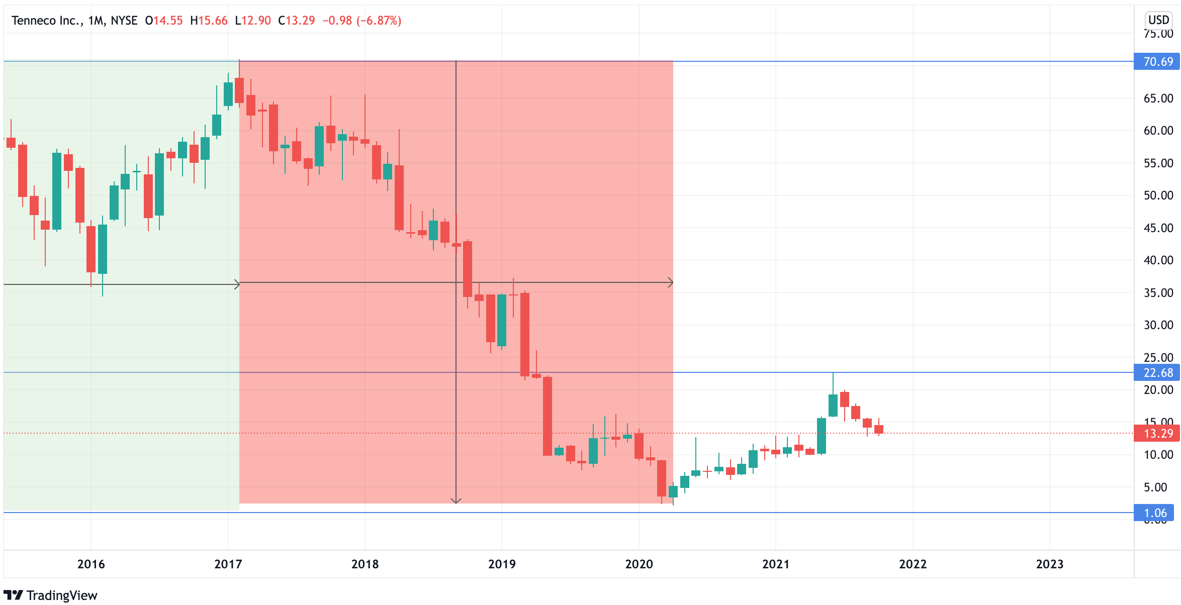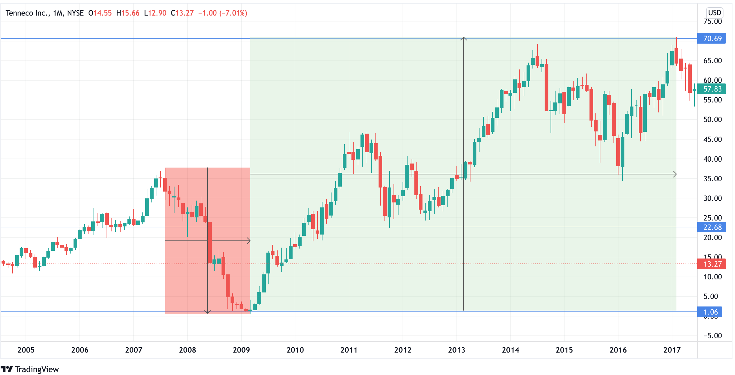 Tenneco’s stock bottomed at around $1 in March 2009, at the lowest point of the GFC (Global Financial Crisis). The stock was selling for $37 only 19 months before.