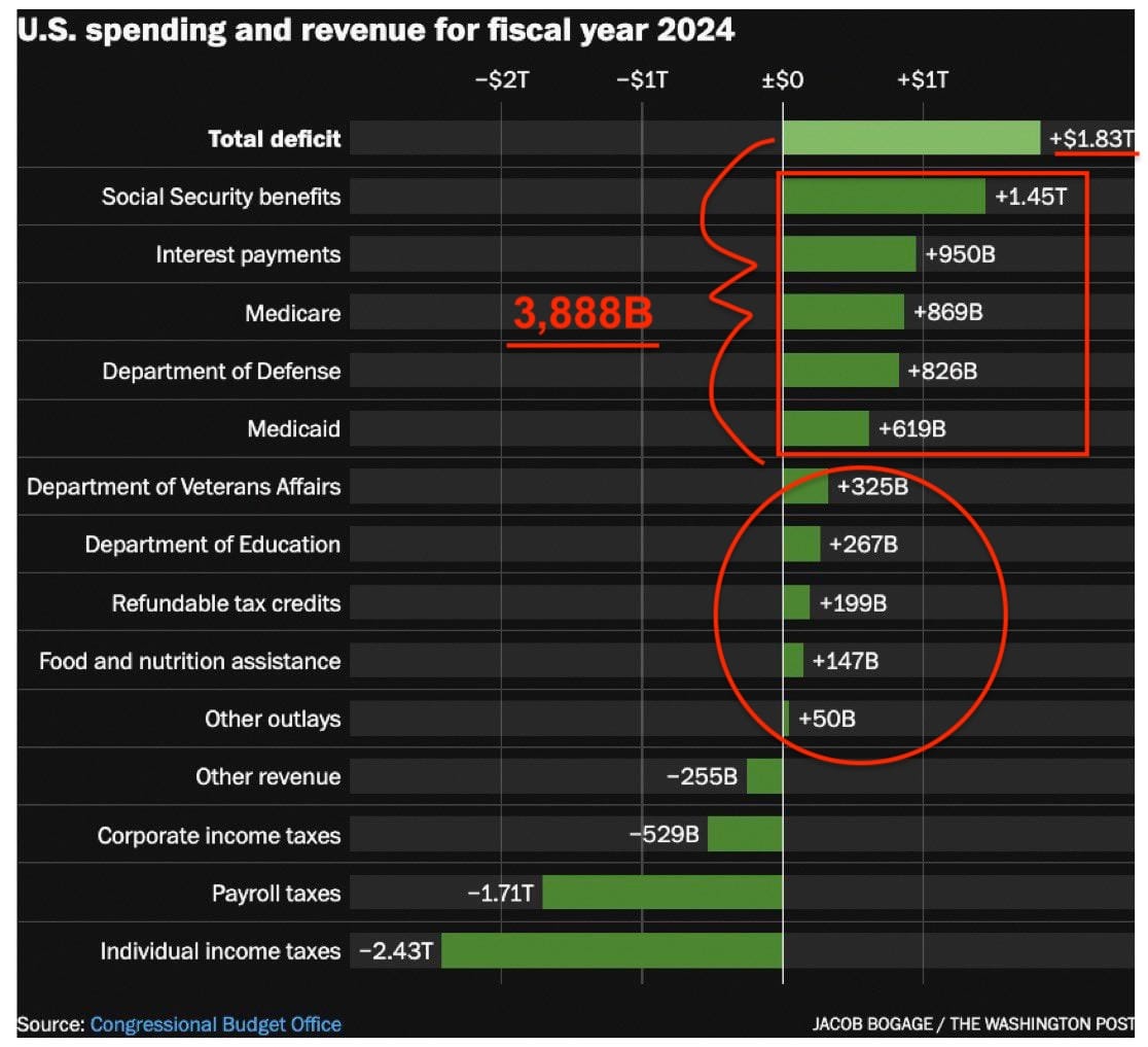 How are you going to cut spending? Trump isn’t about to cut and risk overseeing the worst term since I don’t know when. The US is hooked on deficit spending — without it the machine don’t run. Actions speak louder than words — everyone preaches fiscal prudence but when it comes time to execute, they budge.
