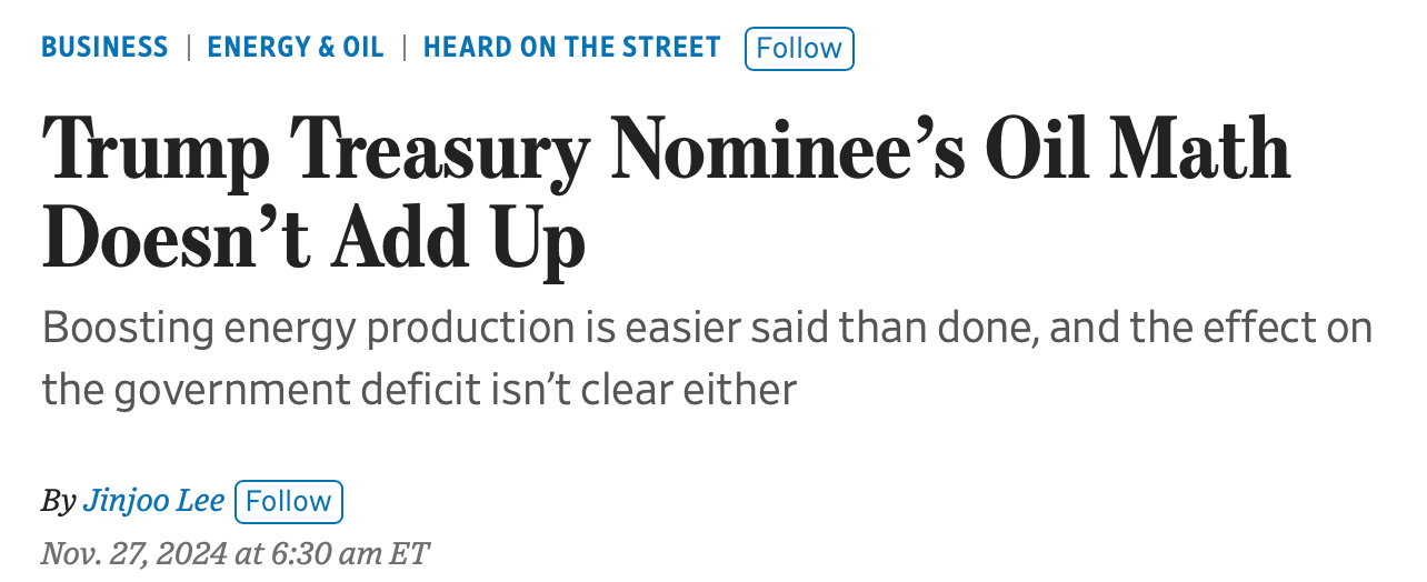 There’s a piece in the Journal this morning on this, they seem to agree with my idea that Bessent won’t be able to influence oil production.
