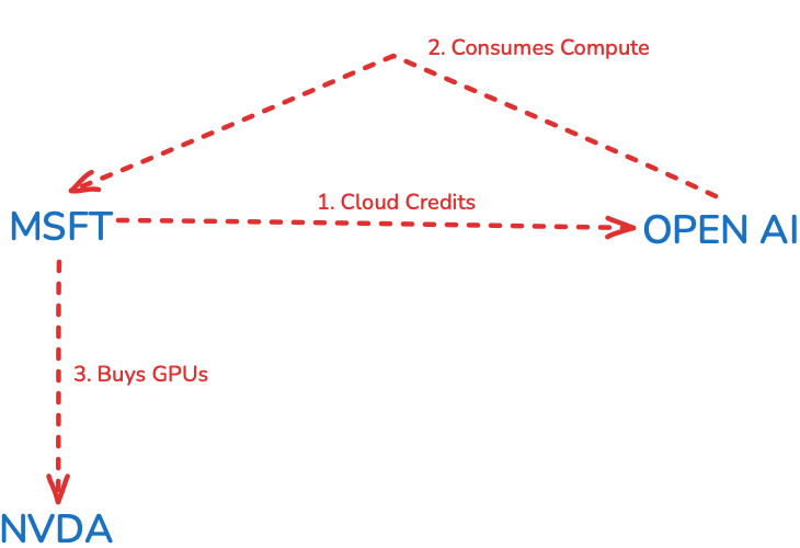 The inception of the process was Microsoft’s pivotal investment into Open AI, not with Dollars but with “Cloud Credits”. This enabled Open AI to train their LLMs, and then run them (i.e. inference) for all of us to use.