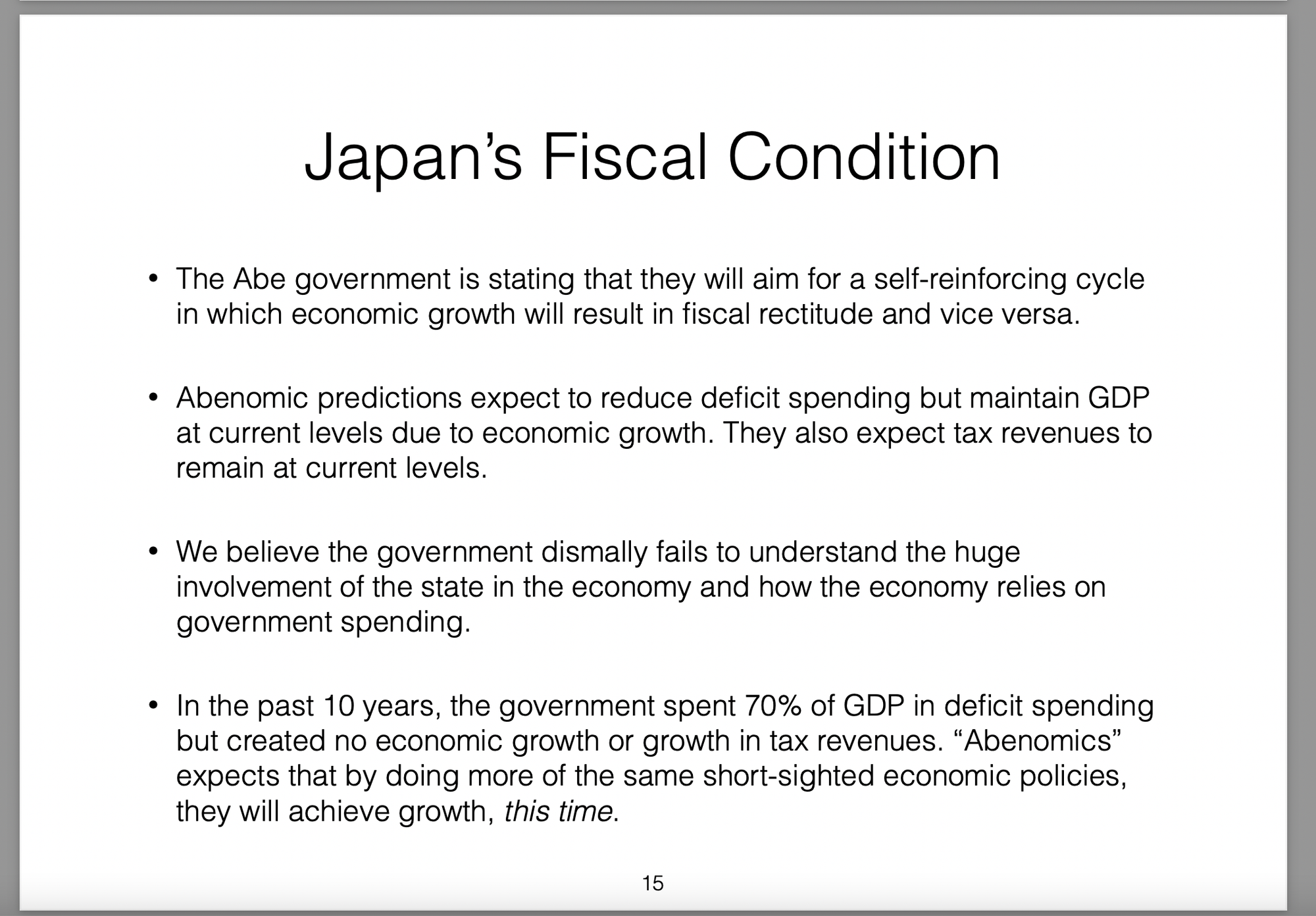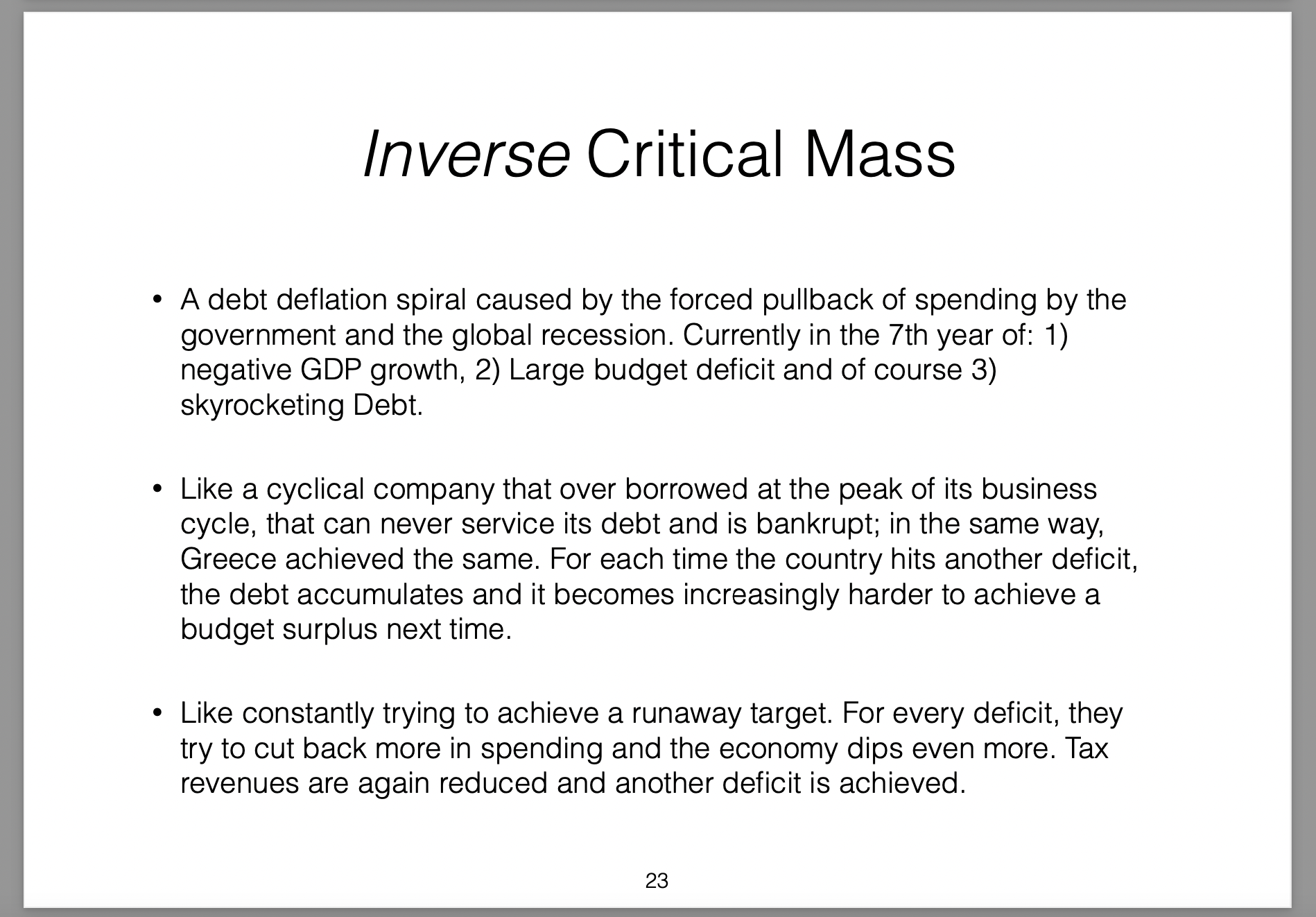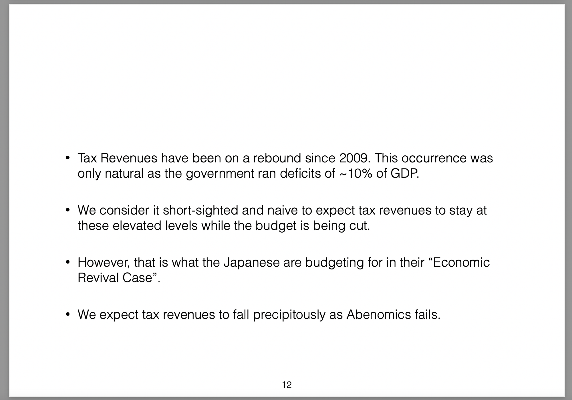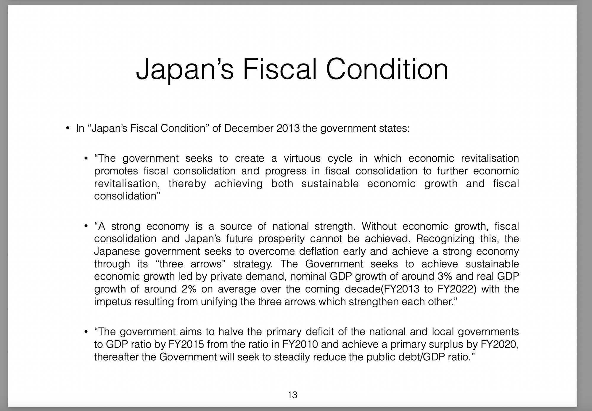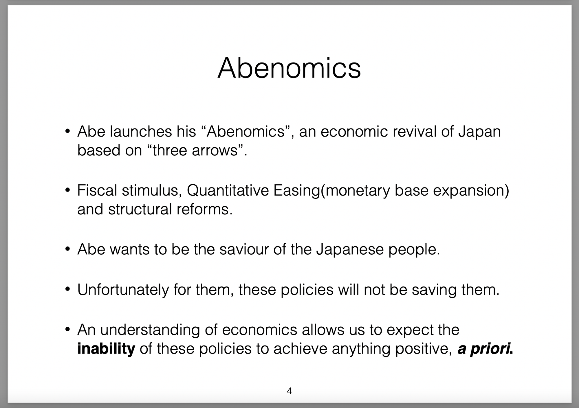 Those policies were broken down into three parts (the three arrows) and labelled Abenomics. In this presentation I offer my own critique of those policies, my view on the results they would produce and then draw analogies with the Greek economic situation at the time.