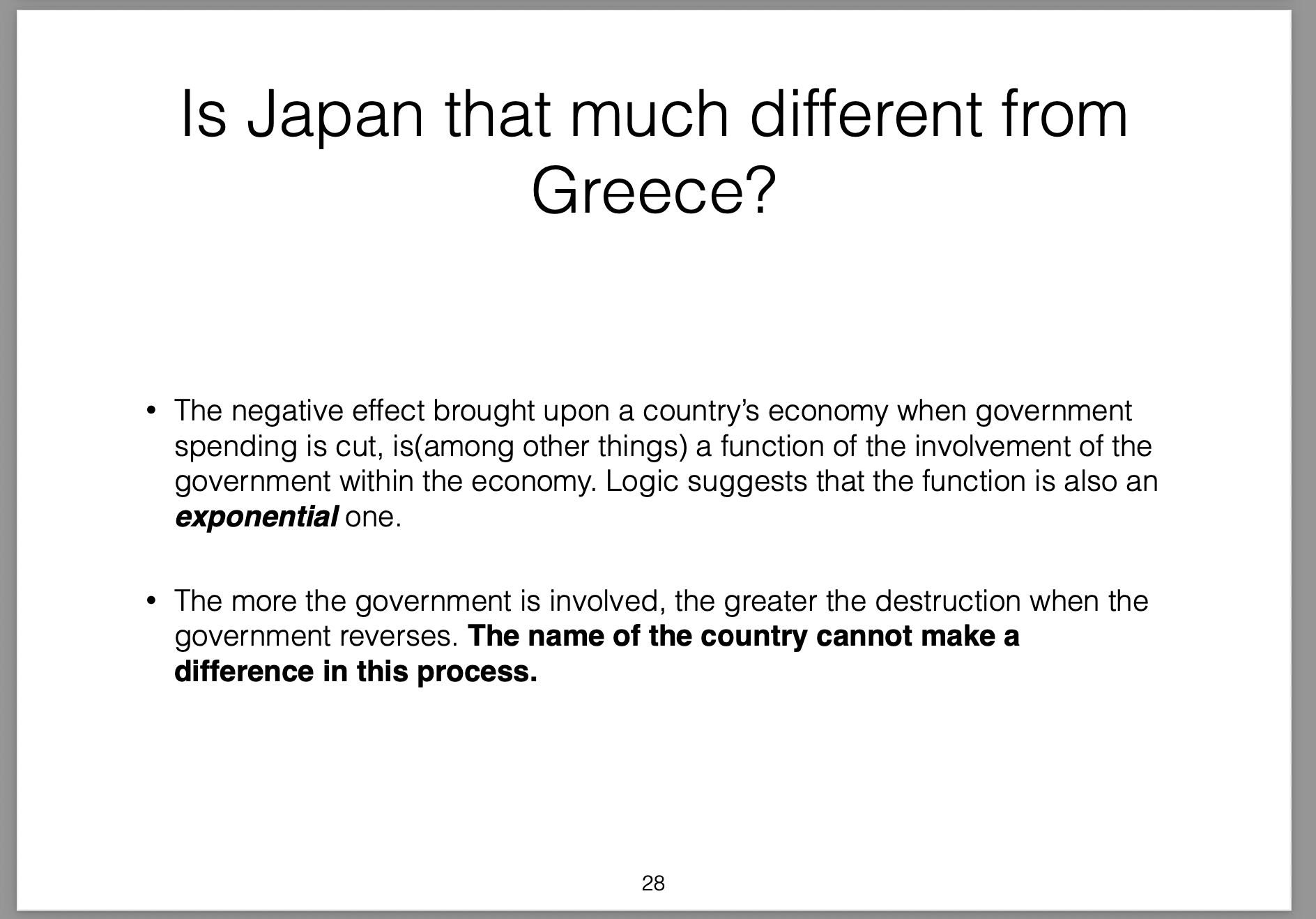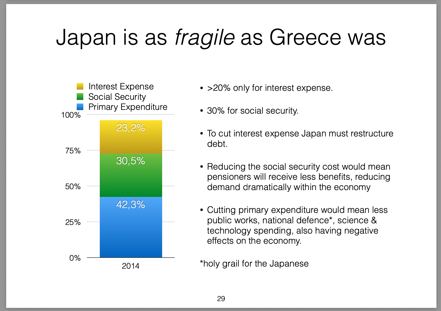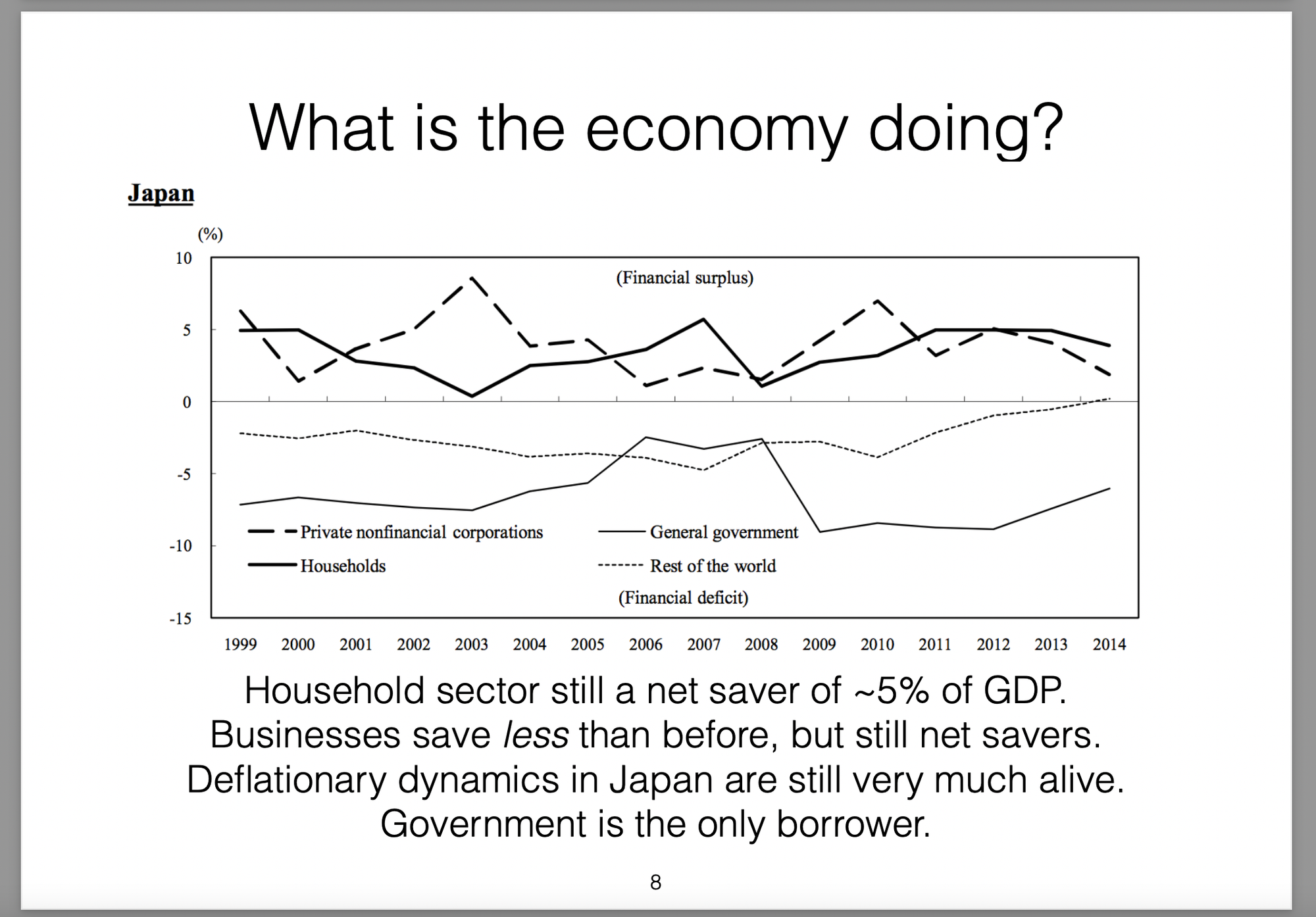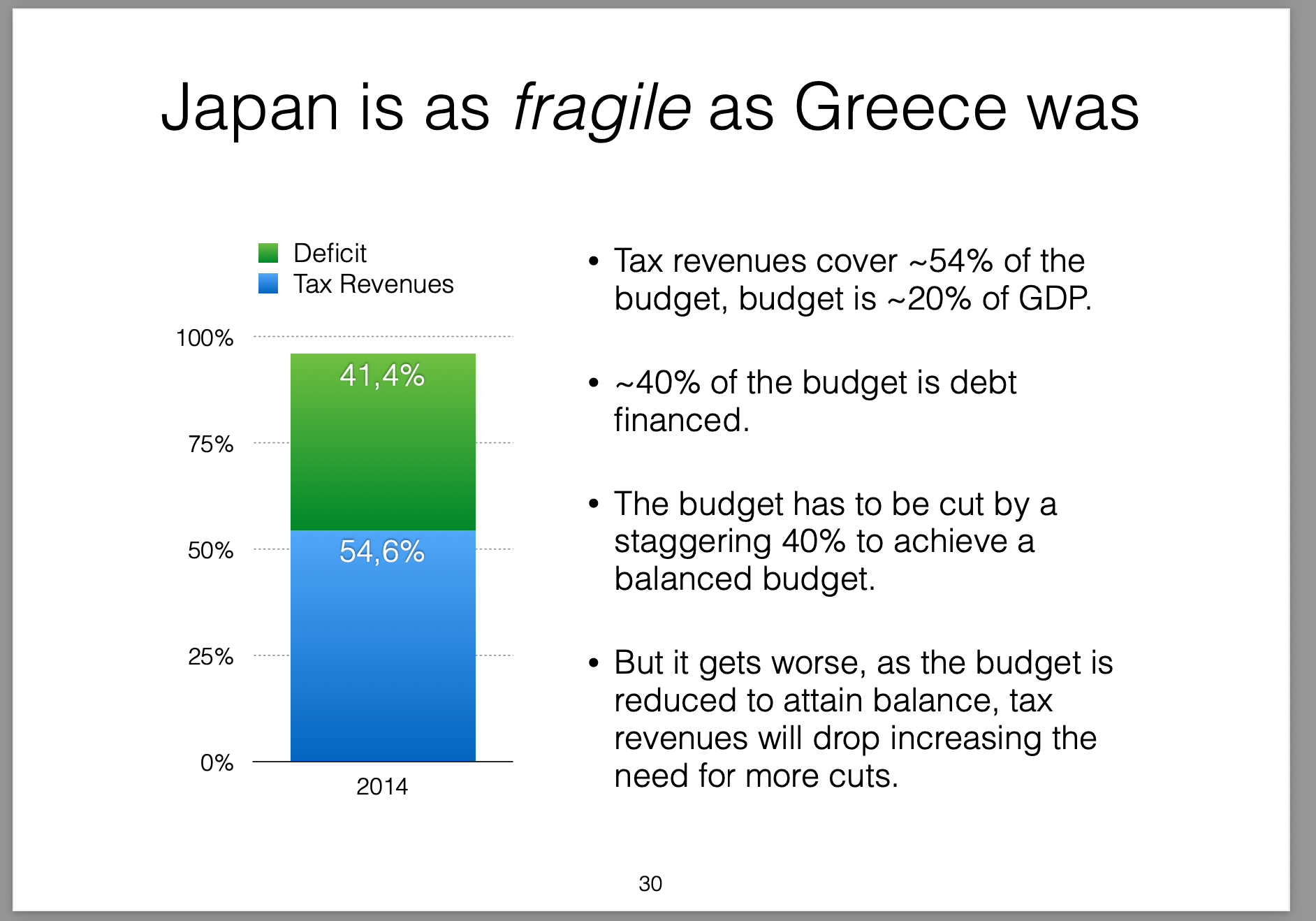 Those policies were broken down into three parts (the three arrows) and labelled Abenomics. In this presentation I offer my own critique of those policies, my view on the results they would produce and then draw analogies with the Greek economic situation at the time.