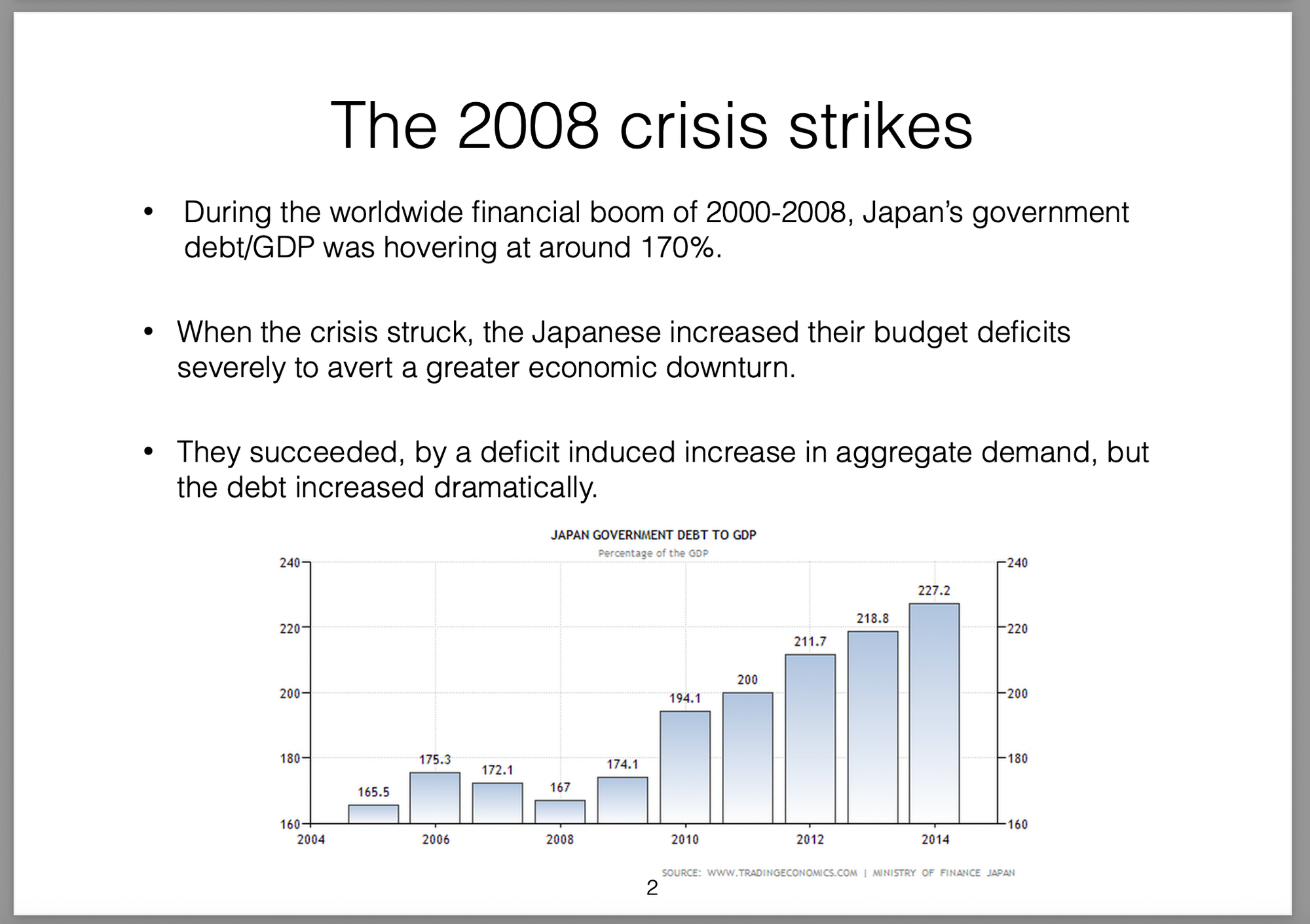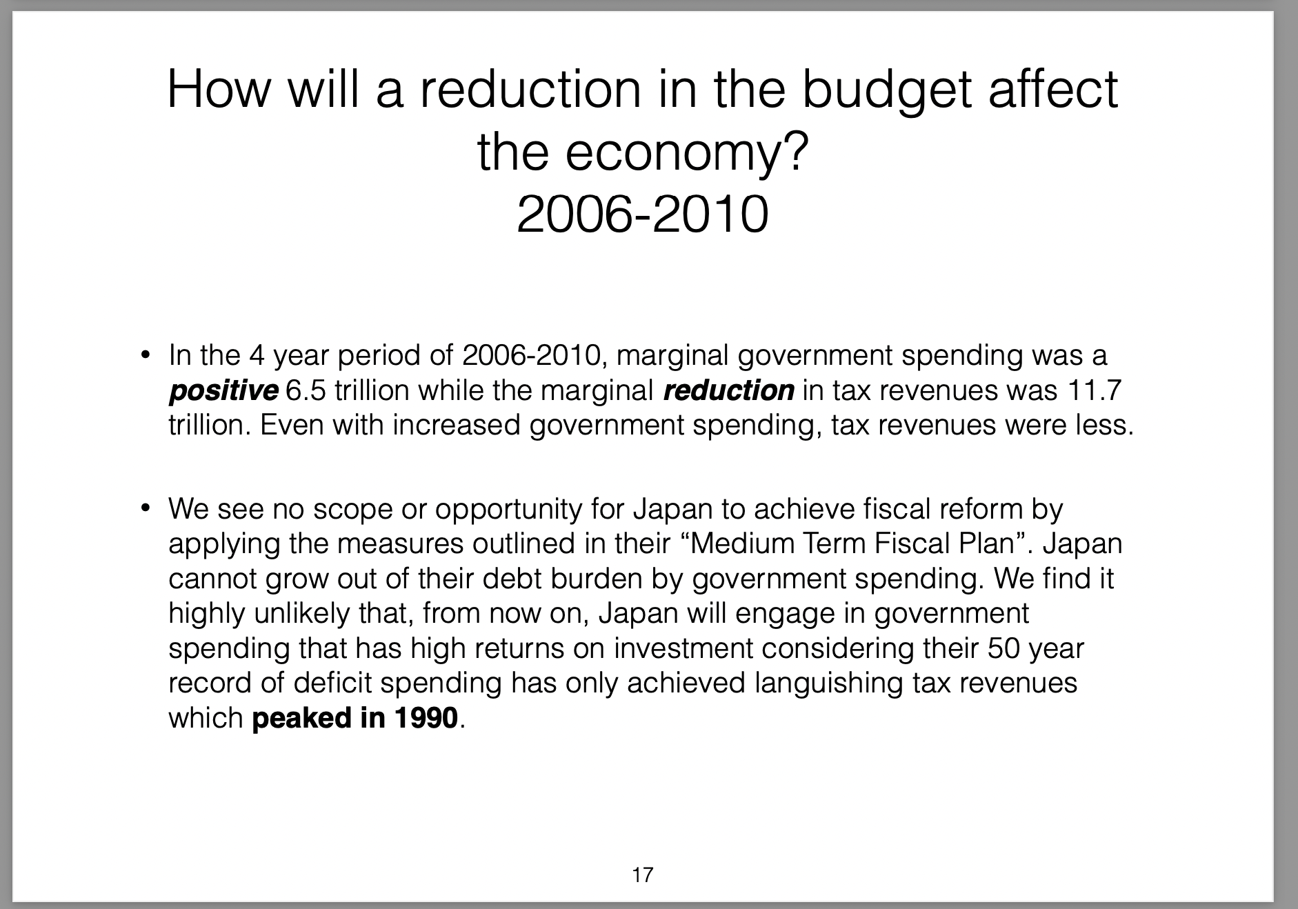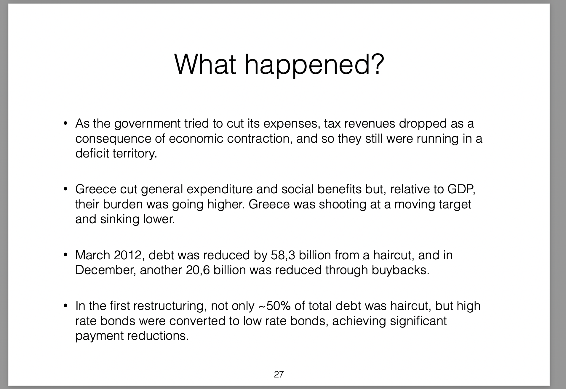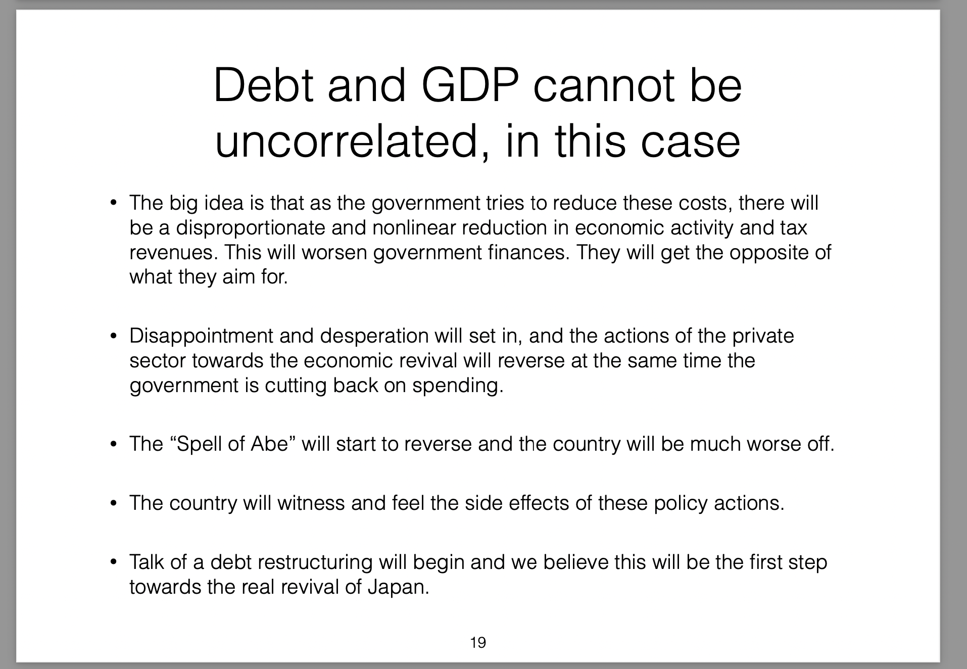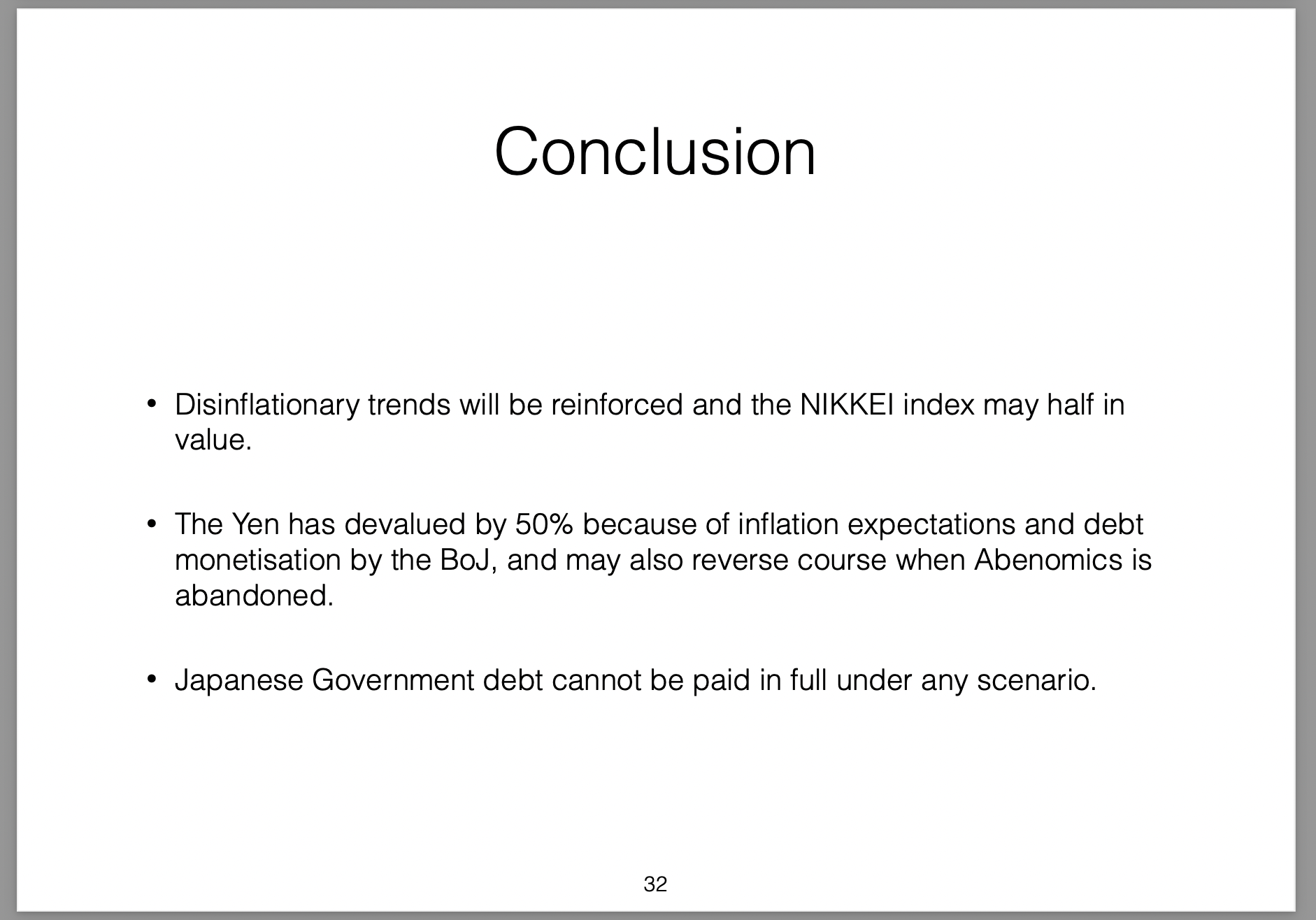 Those policies were broken down into three parts (the three arrows) and labelled Abenomics. In this presentation I offer my own critique of those policies, my view on the results they would produce and then draw analogies with the Greek economic situation at the time.