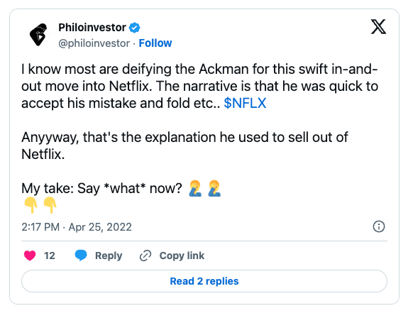 ~20 days earlier, Ackman’s Pershing Square dumped their whole Netflix position on Q1 results after-hours. Ackman came out with a whole letter on his rationale, trying to explain to his investors why he lost >$1 billion on this move.