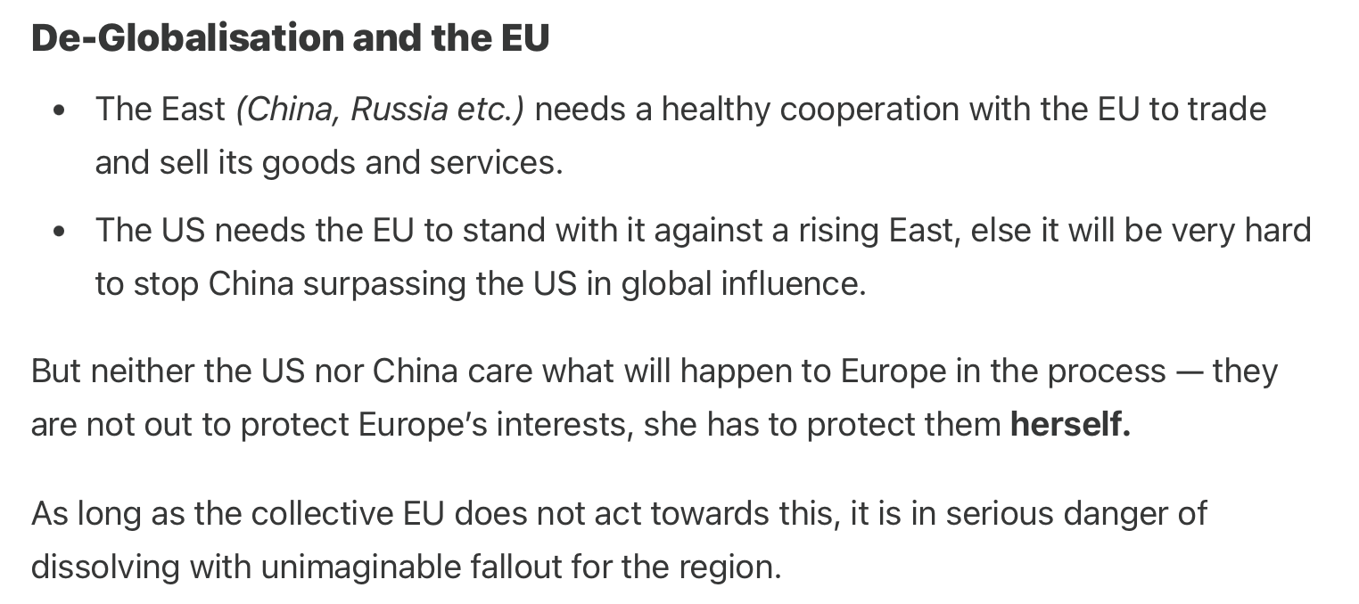 I explained (see excerpt above) that Europa has to protect herself — and neither the US or China cared about the state of the EU, as long as they could leverage her in their ascent to global supremacy.And that the collective EU had to act towards this lest it would risk dissolving…The lack of union and political leadership in the EU, coupled with average monetary policy and a weak European Parliament meant it was all headed that way.