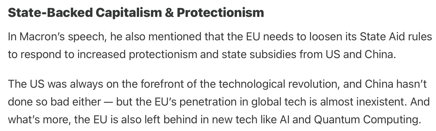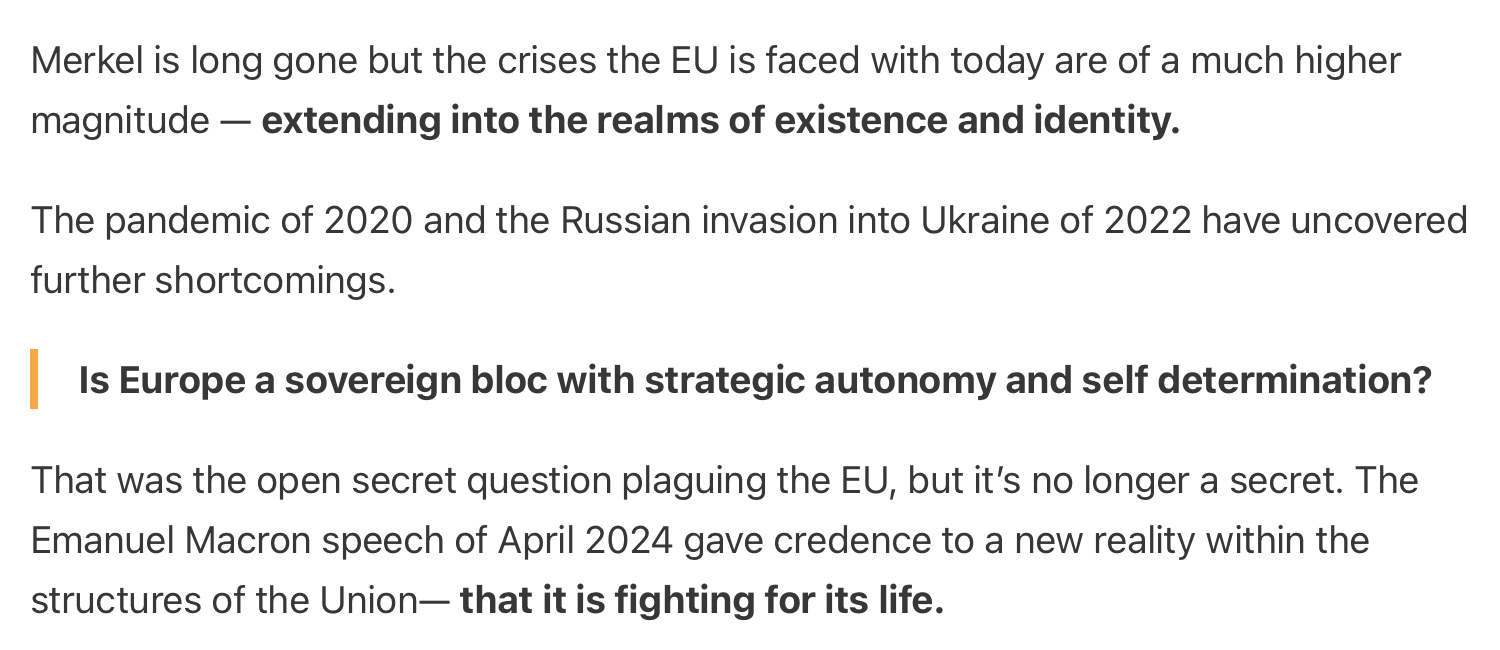 In the piece I explained the existential crisis the EU was going through. The risk was that the EU could disintegrate — as a result of a loss in strategic direction. I also touched on how that crisis connected to a non-vibrant and weak economic environment across the bloc.Competition from the US and Asia was fierce while the EUeans were sitting in Brussels regulating the sh*t out of things Europe didn’t even have yet!